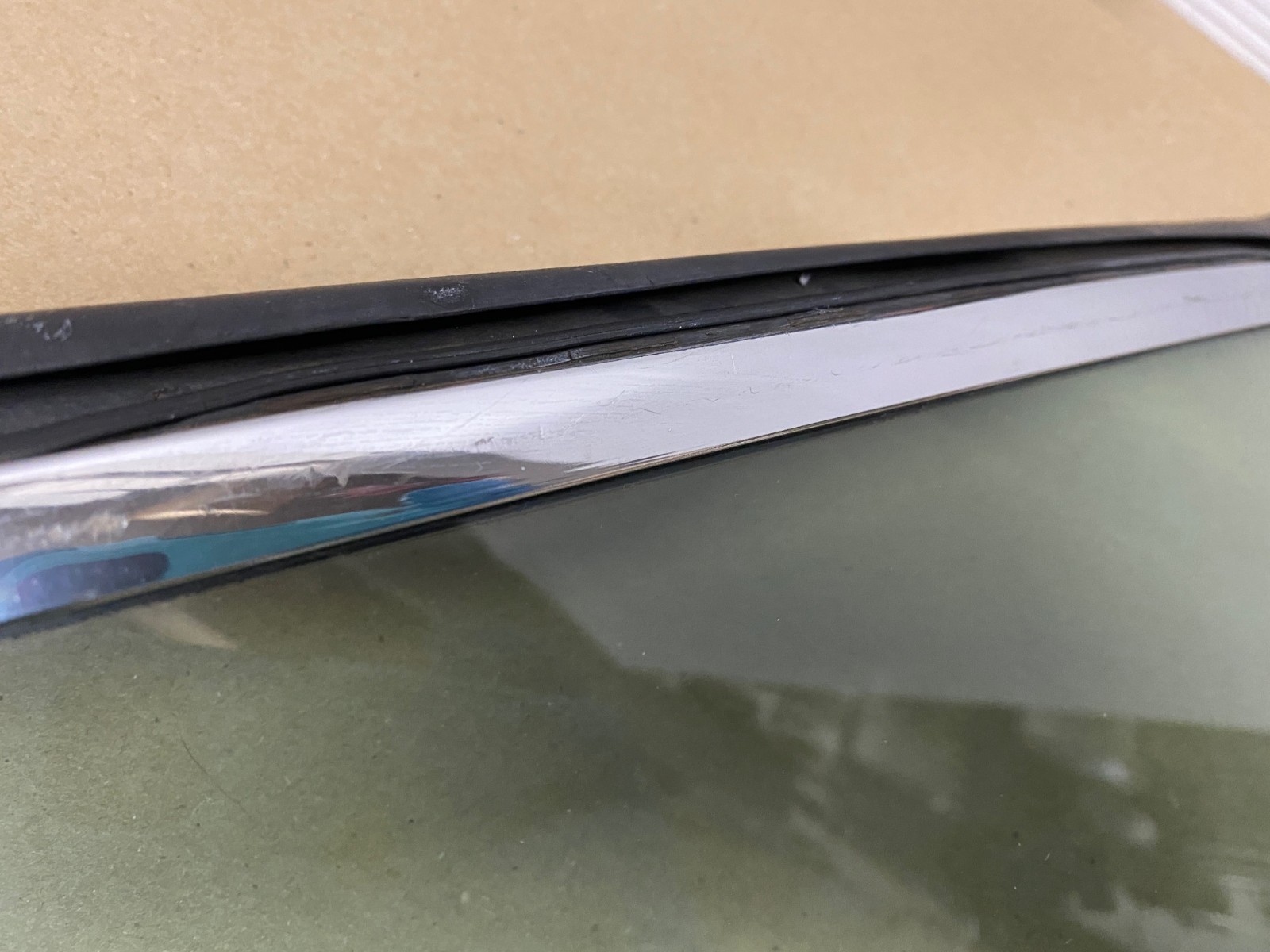 This OEM driver side rear quarter window glass is in good condition. Chrome trim has a decent shine. Has some average wear typical of its age, but no heavy rust/blistering like most. Glass is intact, no cracks. Glass was cleaned briefly, but could still use a little polish to get all the years of road wear off. Still very respectable. Rubber vertical seal come free with this purchase, it is in used condition. Please view the video (https://youtu.be/twu0mFxQ51I