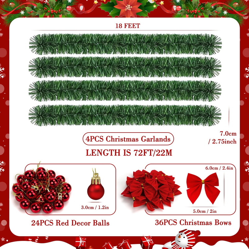 [4-Pack, Total 72 Feet Christmas Garland] - Comes with four 18-foot green garlands for decoration, each long enough to wrap around archways, staircases, the mantle, fireplaces, or door frames. Easily shape them as you like for a custom look.