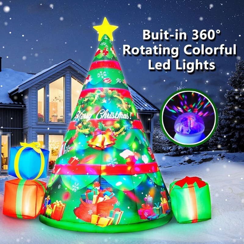 ?7FT Christmas Inflatables Tree with 360 Rotating Colorful LEDs Dazzling Star? zukakii designed this inflatable tree as a magical alternative to a real one. Featured with 3 festive gift boxes and a shining star on top, it comes alive with built-in 360 rotating colorful lights that fill your winter nights with dynamic cheer. It?s sure to become the glowing heart of your yard, captivating neighbors and spreading holiday magic all season long.