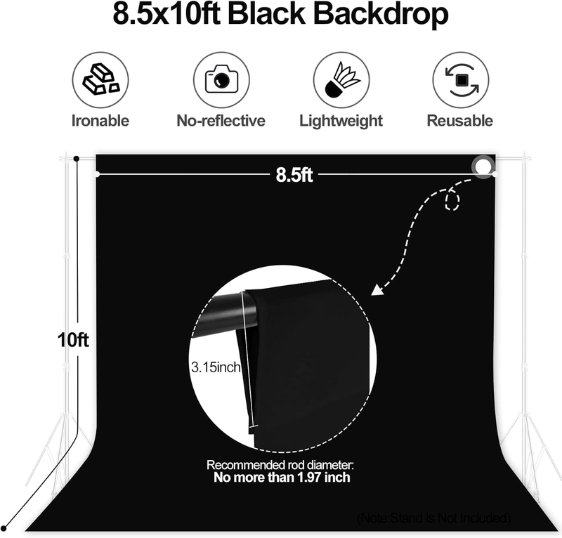 Easy to Maintain - This black backdrop can be machine washable. Wrinkles can be removed in minutes with steam ironing, hanging, or short drying, making it ideal for photo shoots or video recording