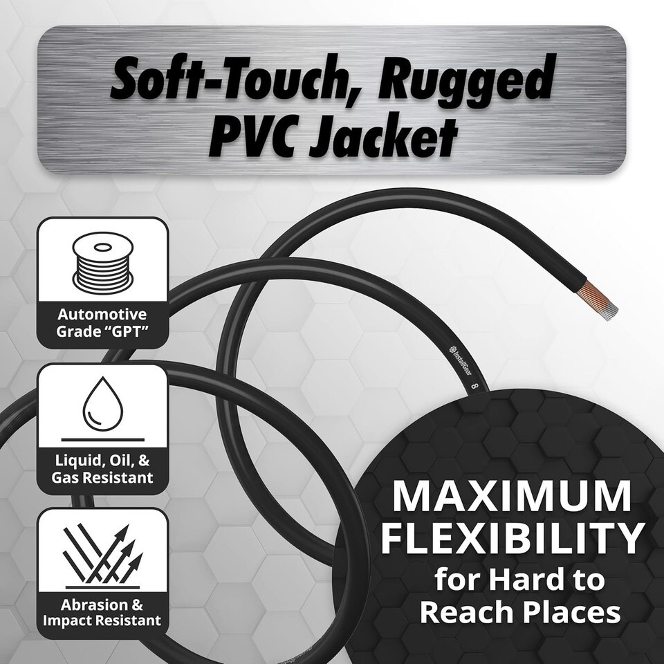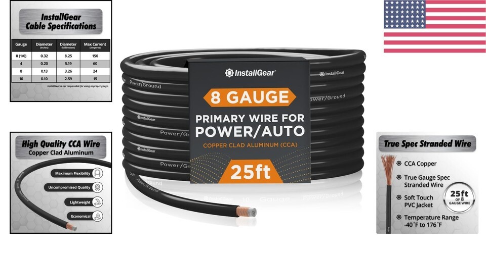 8 Gauge 25-Feet (7.62m) Black CCA Power Ground Wire: Crafted with top-quality materials, ensuring optimal power transfer for your next wiring project. The reduced gauge number signifies a thicker cable, leading to decreased resistance and improved performance.