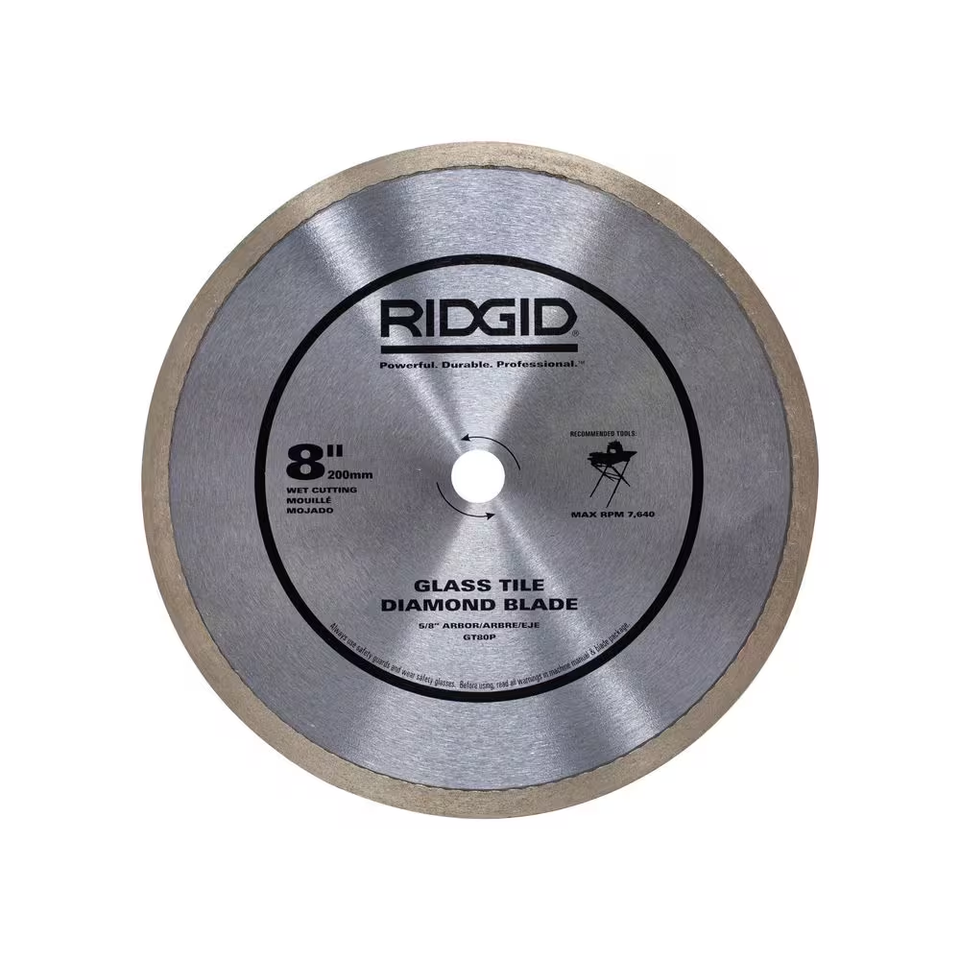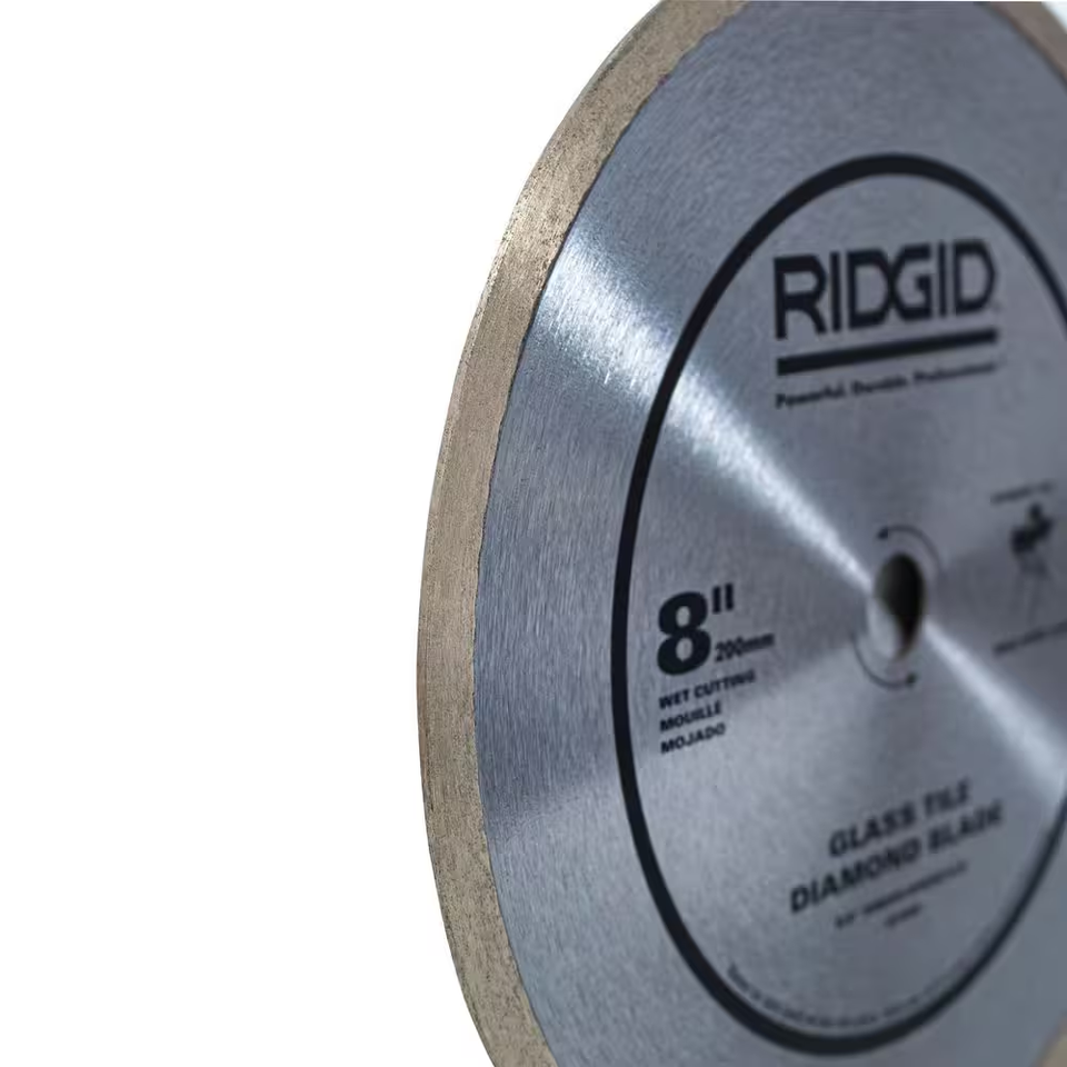 RIDGID Glass Tile Diamond Blades are engineered to cut glass tile, glass mosaic tile, and multi-finish mosaic tile. The continuous rim design with very fine diamond particles achieve precise, clean cuts helping you work quickly and effectively. Use this blade on 8 in. wet tile saws that have a 5/8 in. arbor.