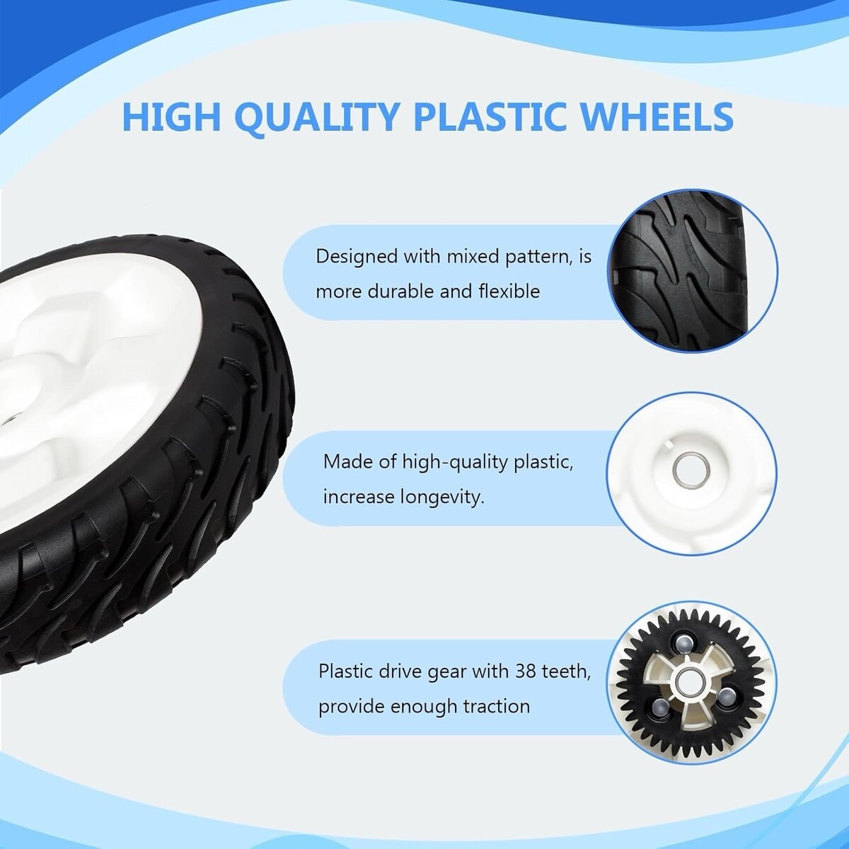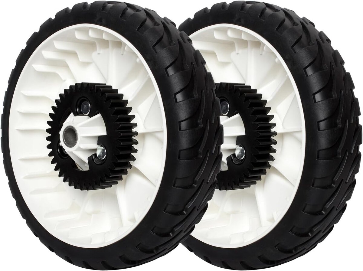Replacement rear drive wheel set (2-pack) compatible with Toro Recycler 22? push and self-propelled lawn mowers. Each wheel features a durable rubber tread, reinforced plastic rim, and built-in 38-tooth drive gear for reliable traction.