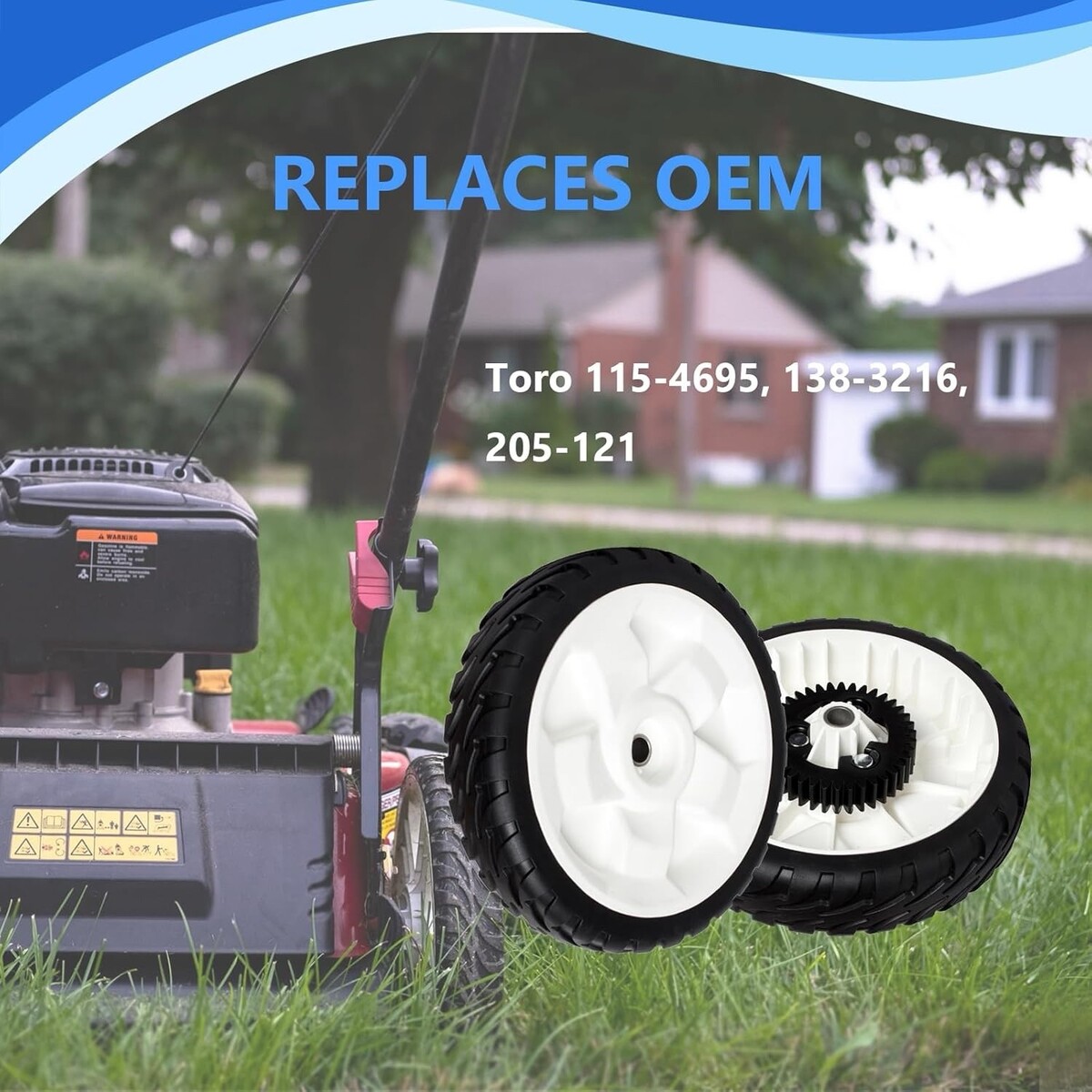 Direct replacement for Toro part numbers 115-4695, 138-3216, and 205-121, these 8? wheels fit a variety of Toro Recycler series models including 20332, 20333, 20334, 20338, 20352, 20373, 20374, 20955, 20956, and 20958.