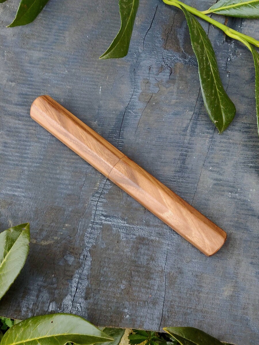I've crafted a unique knife with a sheath featuring an innovative design that ensures a secure fit without the need for any splitting. Instead, I've incorporated a clever insert that snugly embraces the blade. Both the sheath and handle are fashioned from a single piece of wood, creating a seamless, harmonious look. What's more, they are ingeniously held together not by mere friction, but by discreet magnets. These magnets not only provide a reliable grip but also deliver a satisfying click when the components come together. Countless hours of careful consideration and planning have been devoted to perfecting this design, ensuring both functionality and aesthetics.