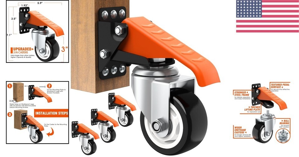 - 880 Lbs Capacity Heavy Duty 3" Retractable Casters Kit - Perfect for Workbenches