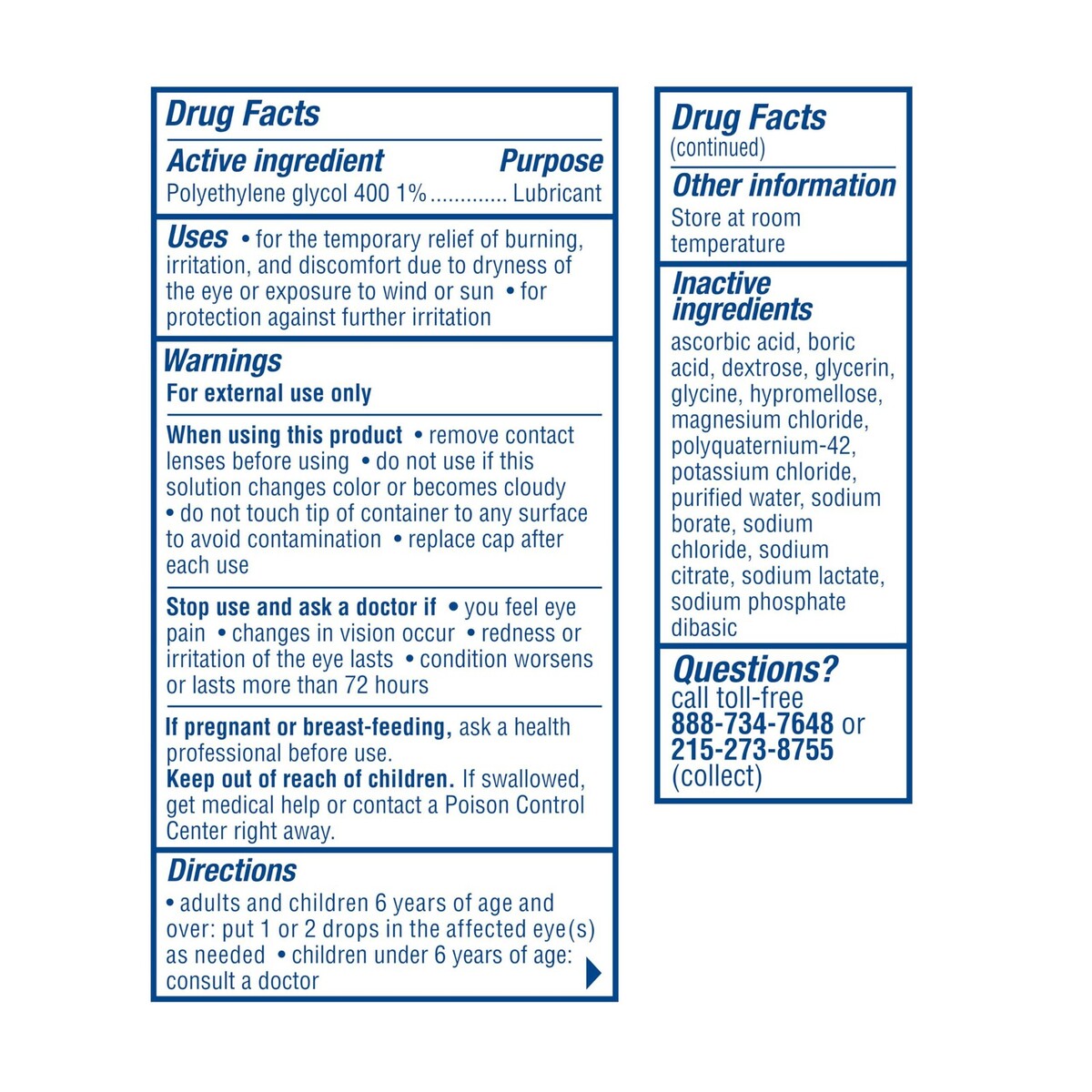 Expiration Date of 9/2026 ? 0.5-fluid ounce bottle of Visine Dry Eye Relief All Day Comfort Lubricant Dry Eye Drops to moisturize and soothe dry eyes and protect against further irritation ? Sterile moisturizing eye drops start working in seconds to provide temporary relief of burning, eye irritation, and discomfort due to dryness of the eye ? These eye drops start to relieve dry eye in seconds ? From Visine, a brand backed by 60 years of expertise, these eye drops featurethe lubricantpolyethylene glycol 400 andprovide up to 10 hours of comfort ? Visine All Day Comfort Dry Eye Relief Eye Drops are available in a small, convenient-to-carry bottle for convenient relief anywhere, even on-the-go