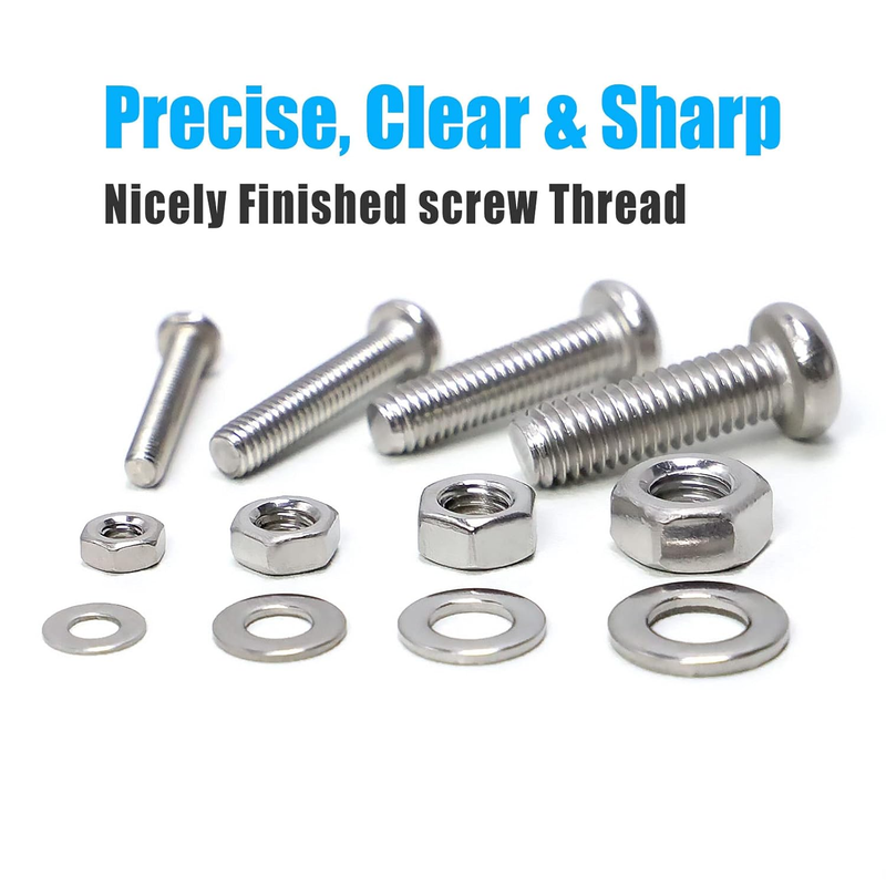 Each set includes 24 sizes of metric fasteners (M3, M4, M5, M6) in popular lengths ? 8mm, 12mm, 16mm, and 20mm ? to cover a wide range of home, automotive, and DIY needs. The threads are sharp, clear, and precise, ensuring easy installation without burrs or slipping.