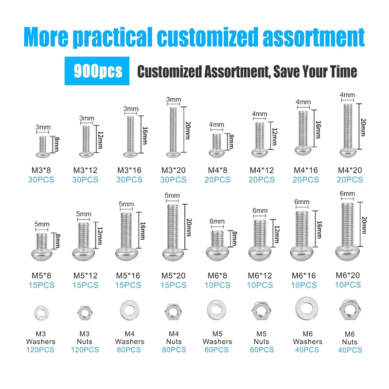 - 900pc Stainless Steel Metric Screw Kit M3 M4 M5 M6 Nuts Bolts Washers Assortment