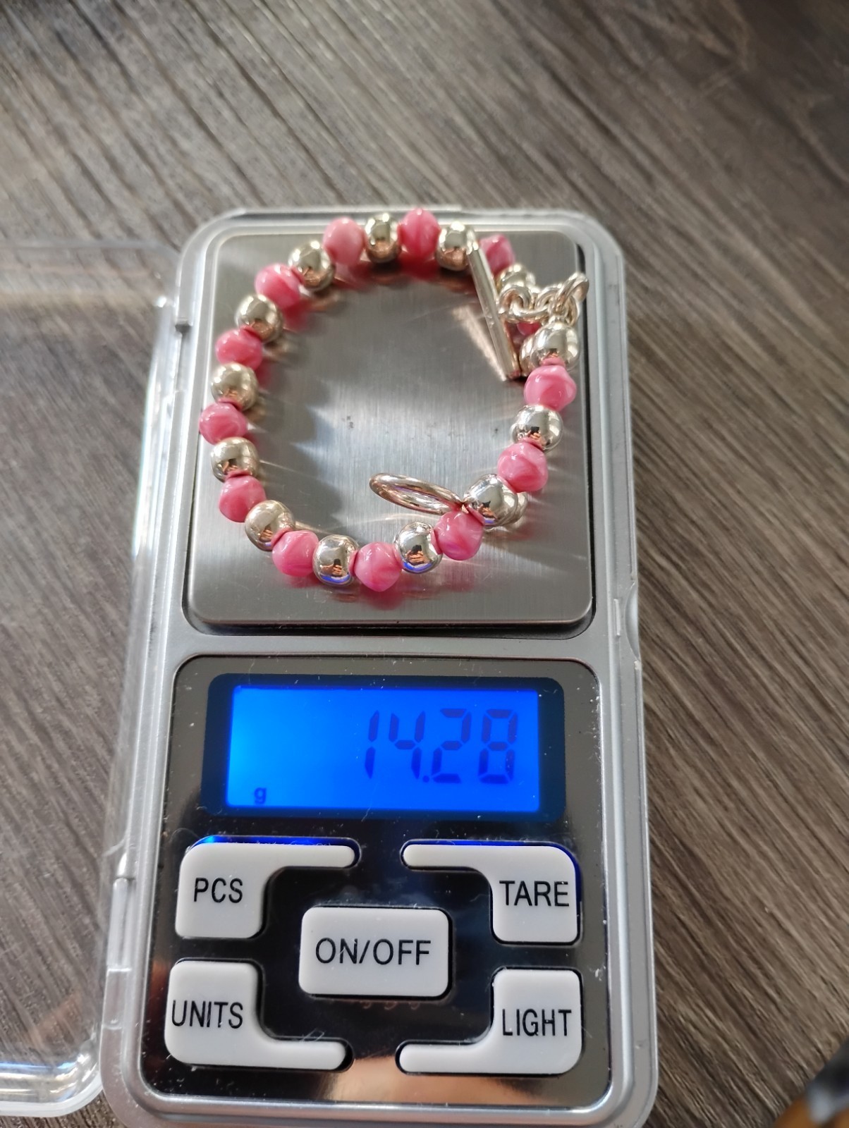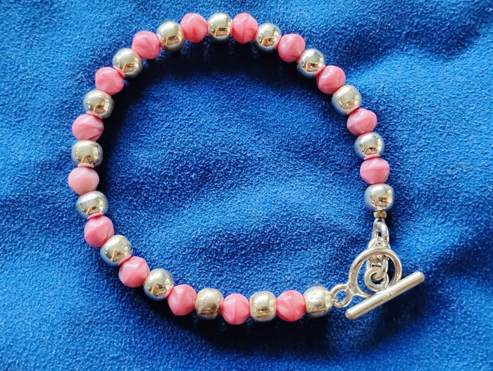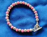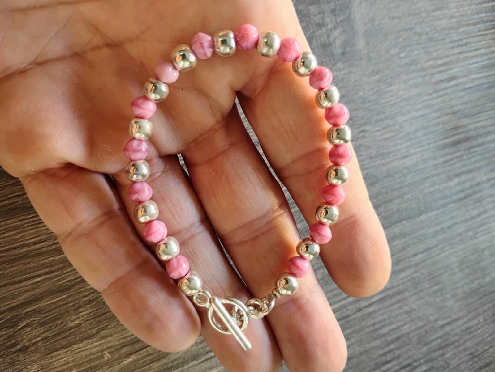 - 925 Sterling Silver 6 Mm Pink Beaded Toggle Link 7.5 In Bracelet Free Shipping