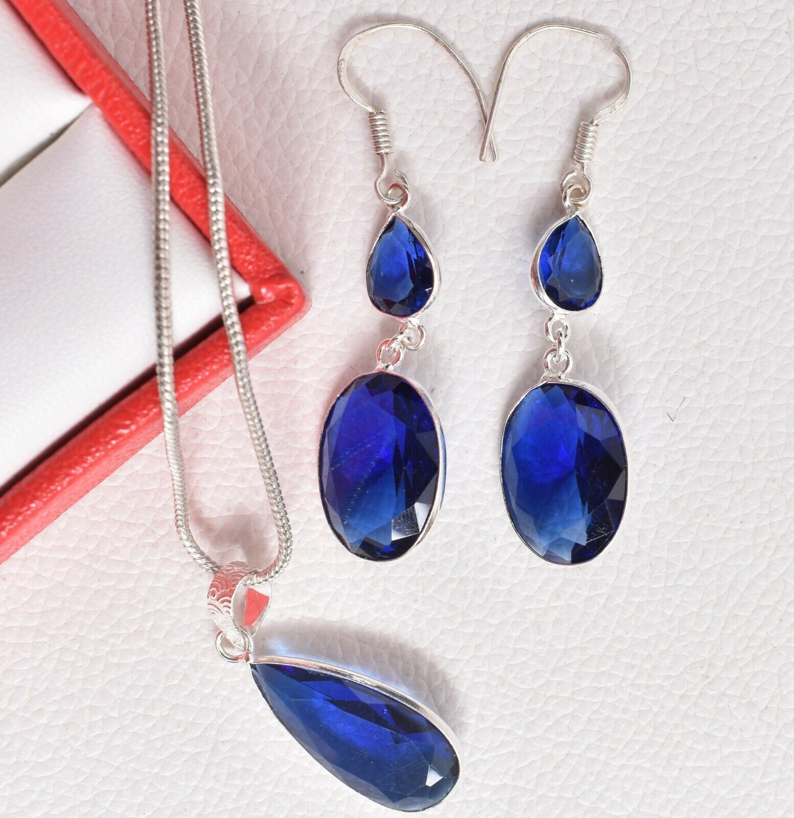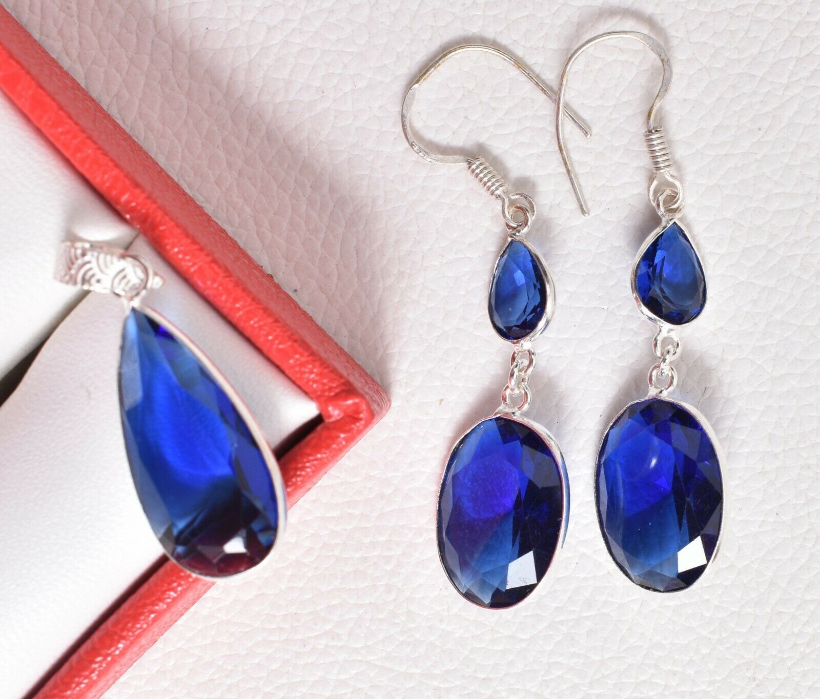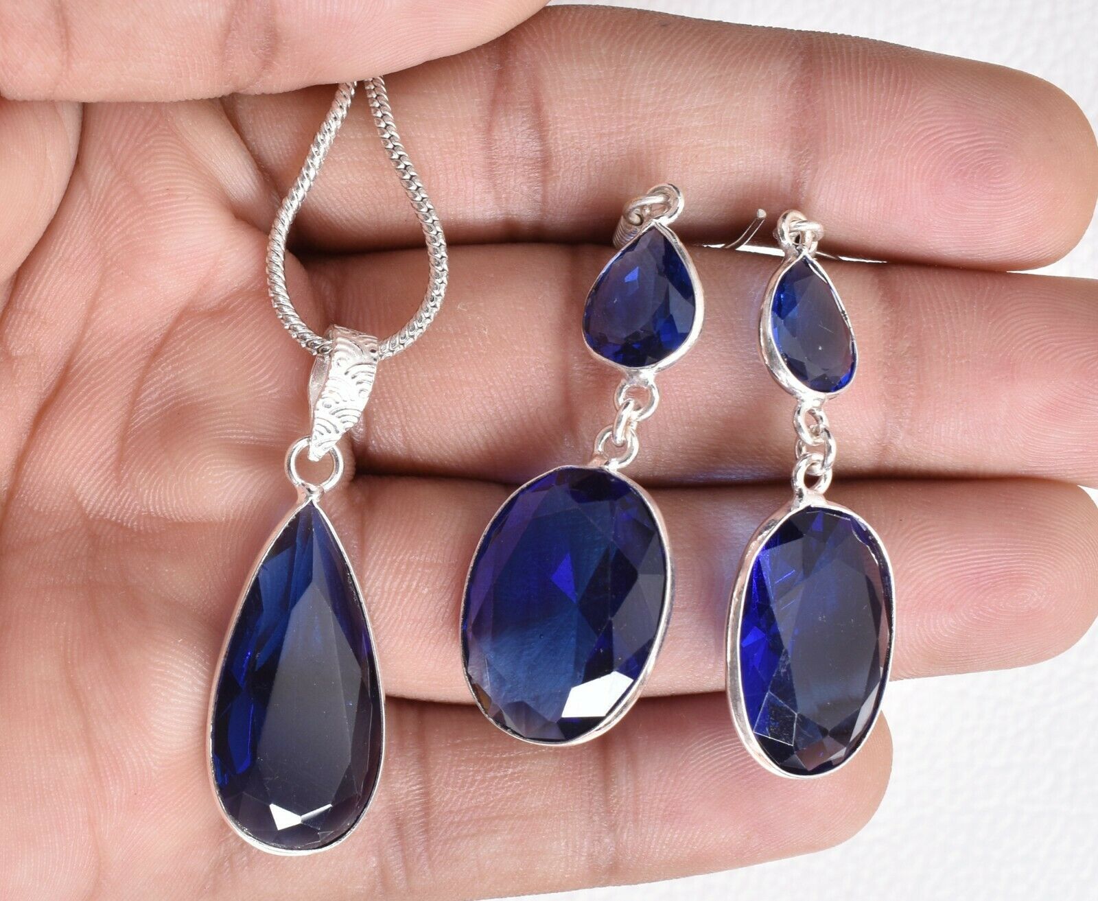 925 Sterling Silver Blue Topaz Gemstone Handmade Necklace Earrings Gift SET-1053