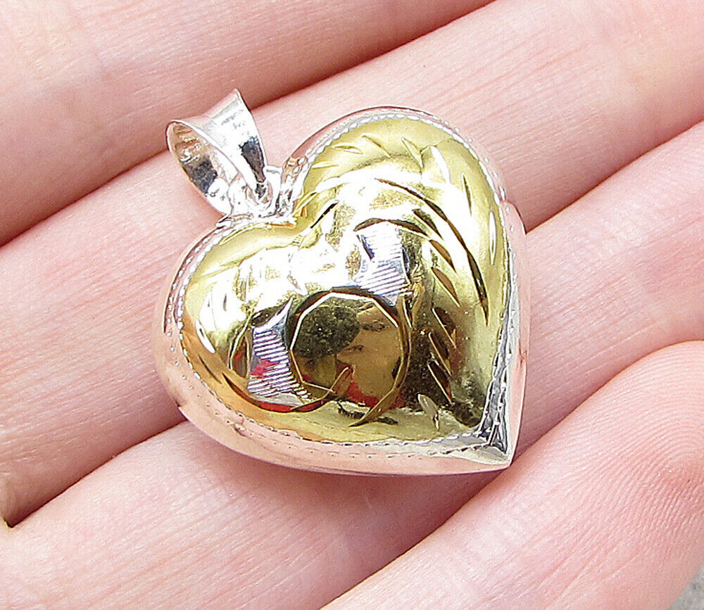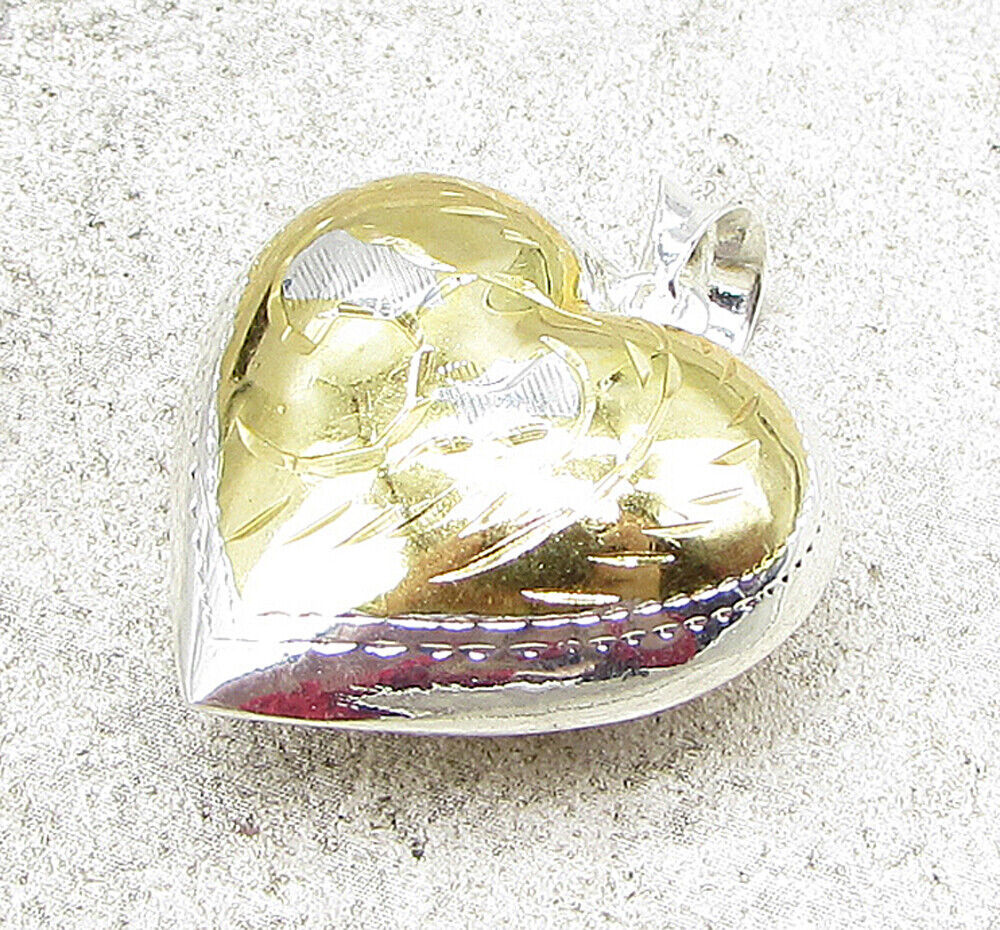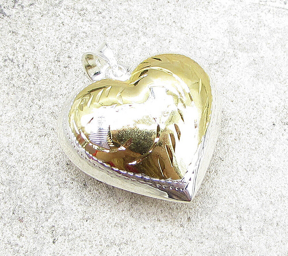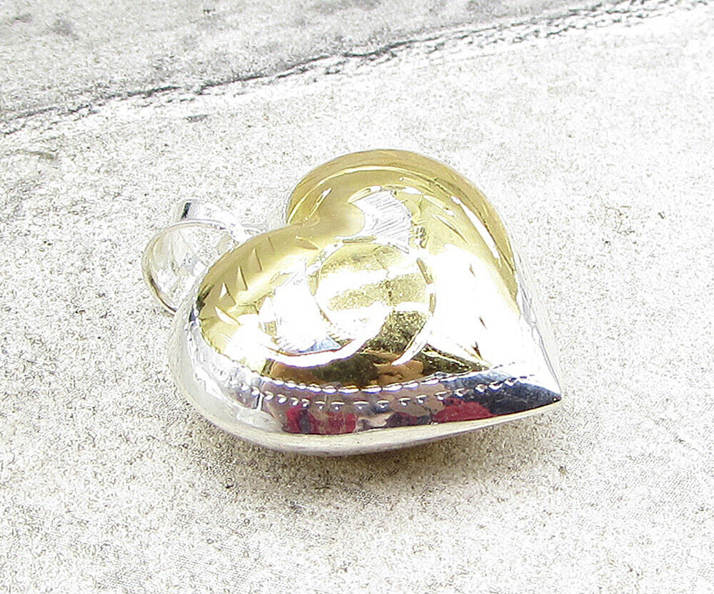- 925 Sterling Silver - Hand Chased 2-Tone Puffy Love Heart Drop Pendant - PT1444