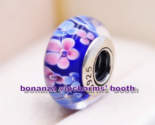- 925 Sterling Silver Handmade Bead Lampwork Blue Flowers Murano Glass Charm