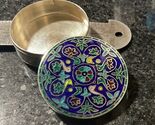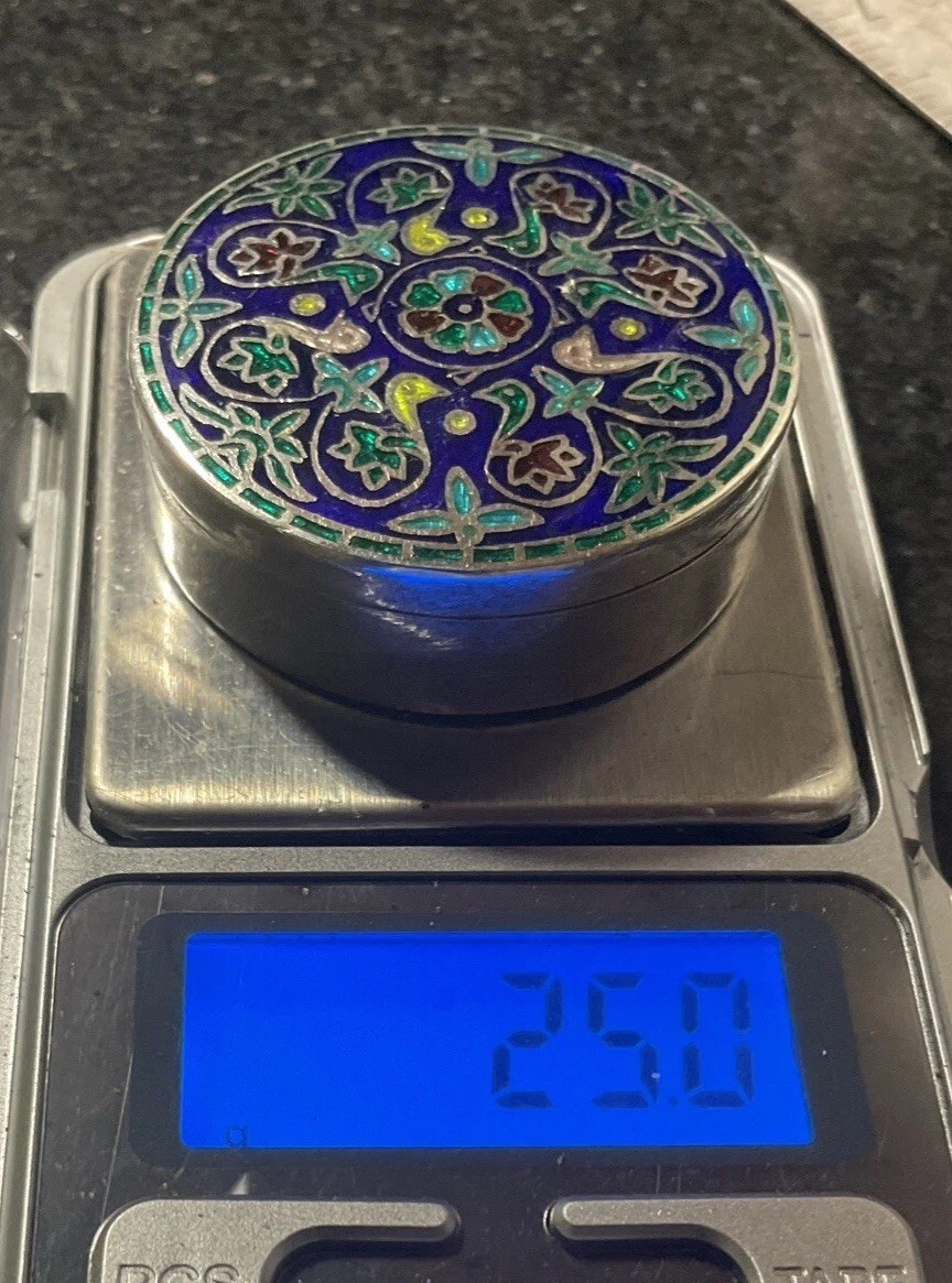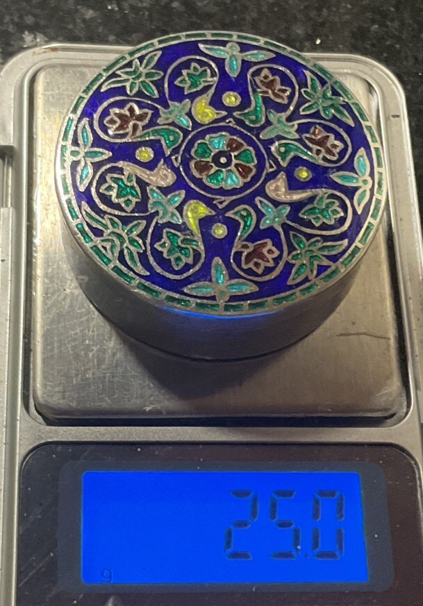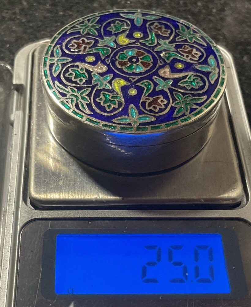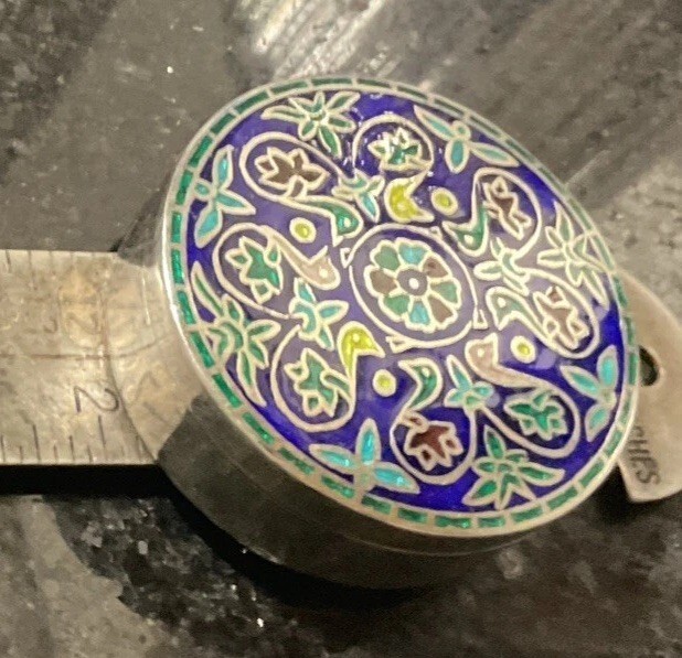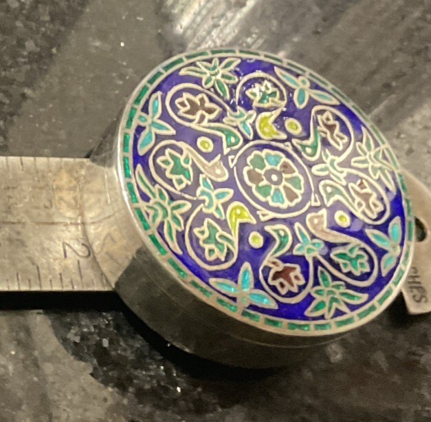 This Vintage piece is a wonderfully ornate and multi colored approximately 2? in diameter. The lid is very beautiful with an artsy design well made enamel with exquisite designs ! More than 1/2 inches in height this is a nice sized little Steeling silver 925 pill box! The weight is 25 grams. It also has a tight fitting lid that slides onto the bottom and stays closed well and secure ! This is a product of somewhere in the Middle East according to the elaborate and colorful design pattern that has been handcrafted onto the lid ! This is a unique one of a kind piece ! See photos of the actual item that you will receive !