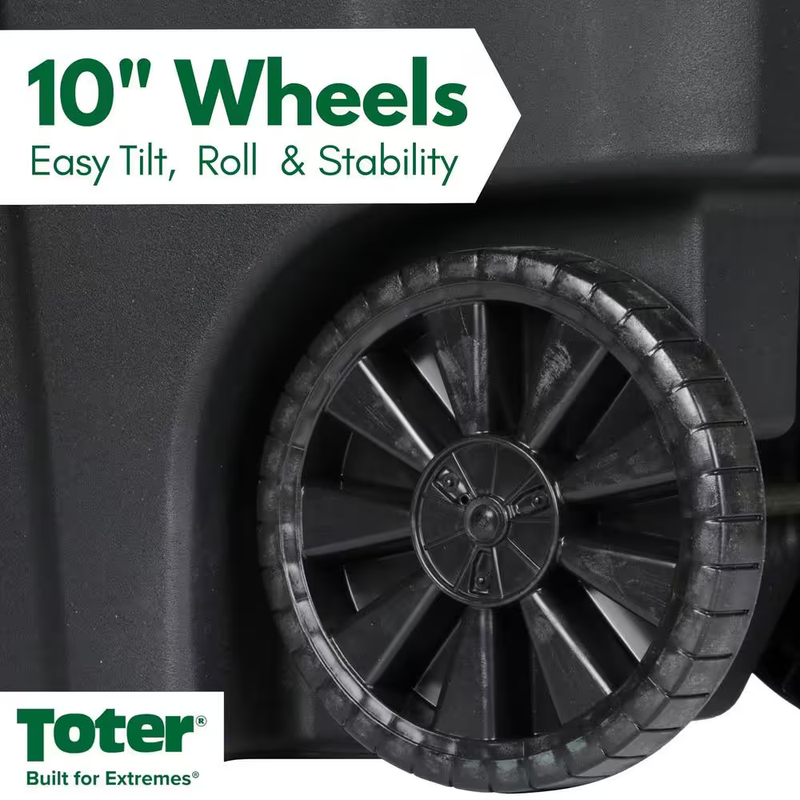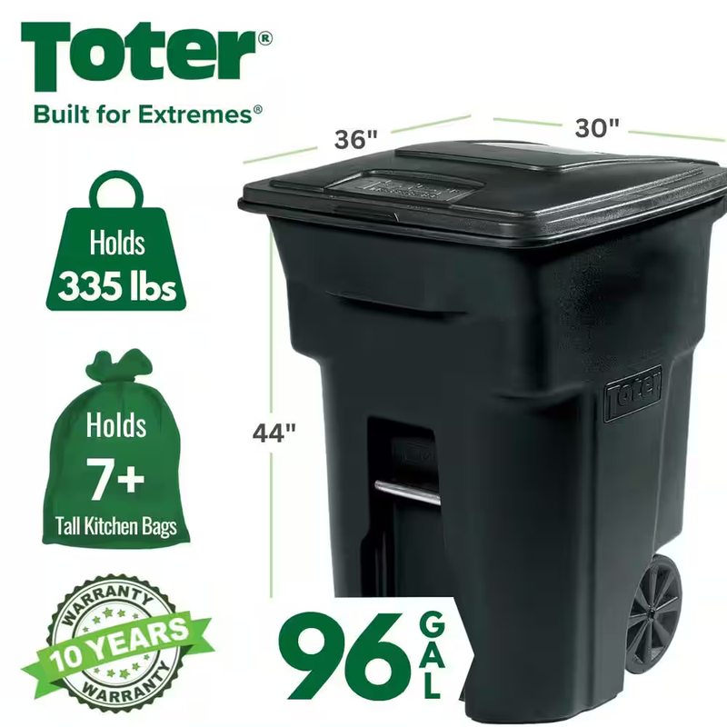 The Toter bin is built to last and designed with ergonomics in mind. With an ideal handle height and rugged wheels, the Toter bin makes maneuvering a breeze. Toter bins are designed to keep working long after others fail by using Toter's Advanced Rotational Molding process. The rugged rim technology and reinforced material in critical wear areas, adds rigidity and extends the service life of the Toter bin. Perfect for indoor or outdoor use, this can is made of up to 50% recycled materials and is 100% recyclable.