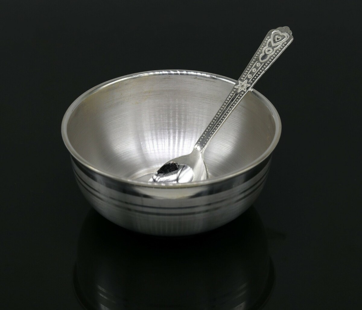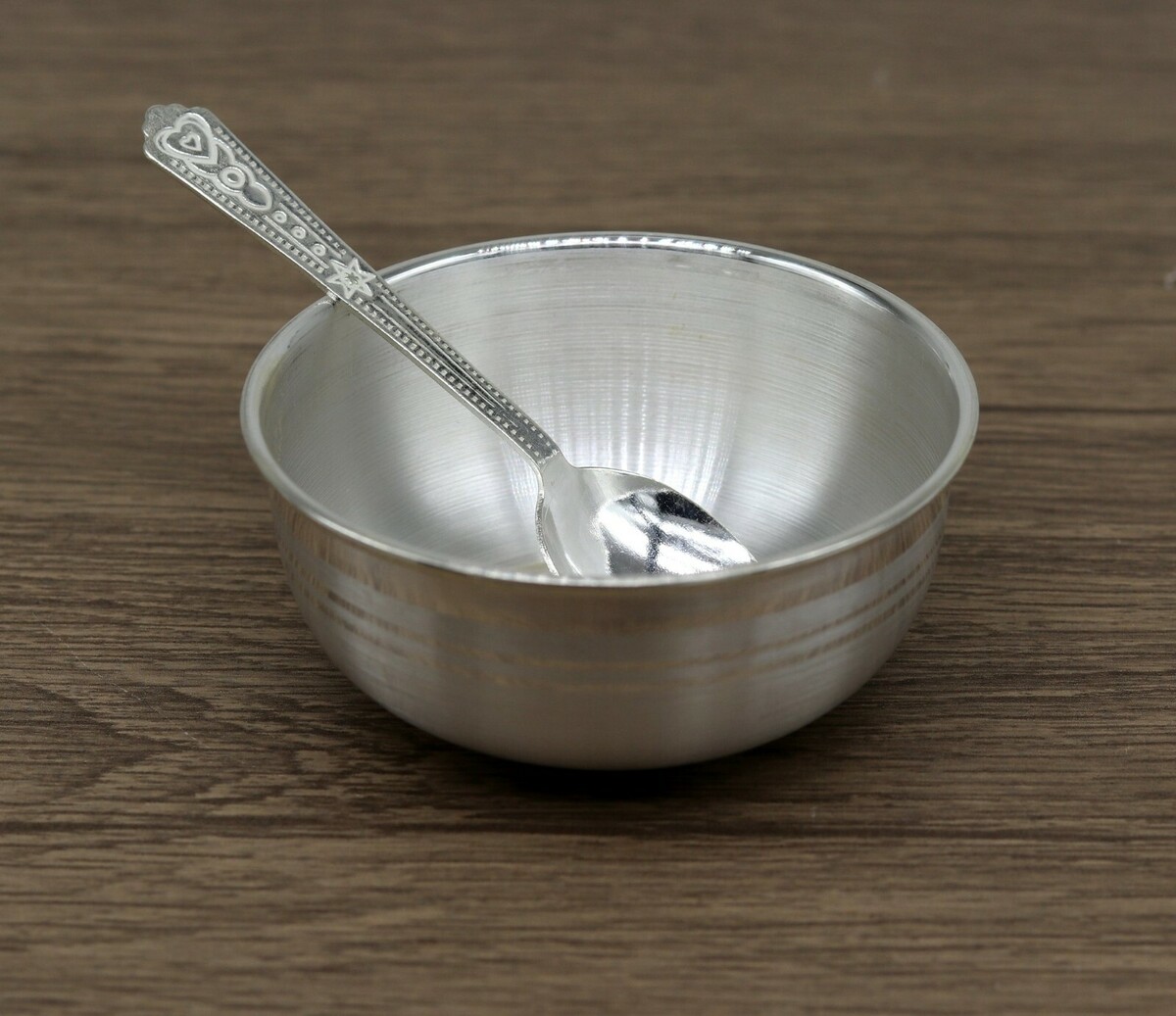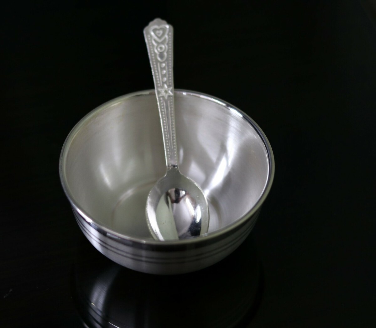 999 fine silver handmade bowl and spoon set, excellent gifting home dining decor silver vessels, Indian opinion is silver has proven antibacterial properties. It is believed that eating out of the same is healthy and can help prevent disease-causing bacteria from spreading. This is one of the main reasons medicines are given to babies in silver bowls or trays.