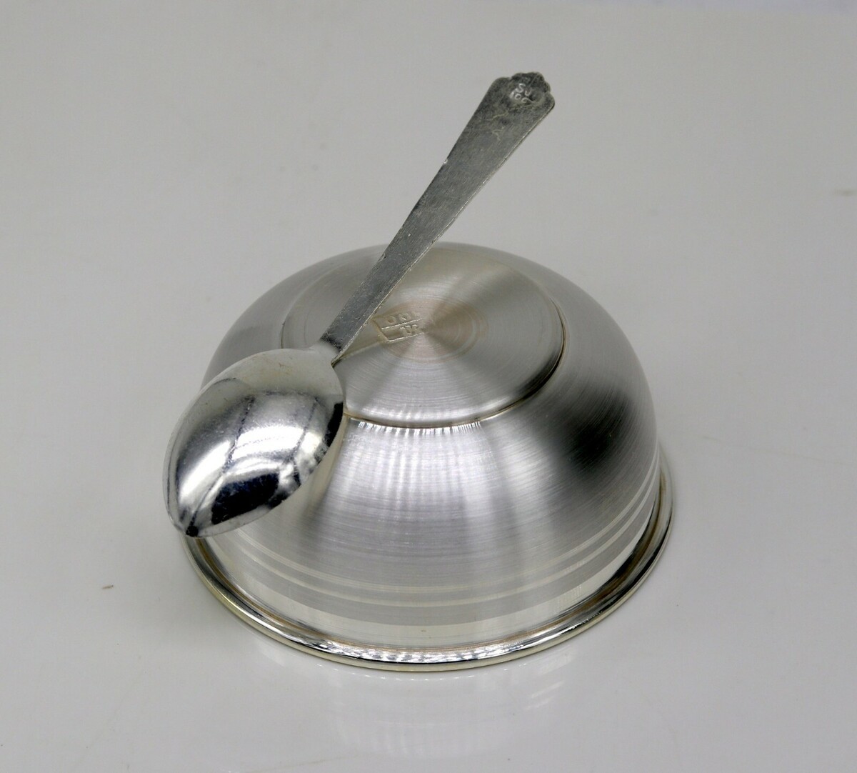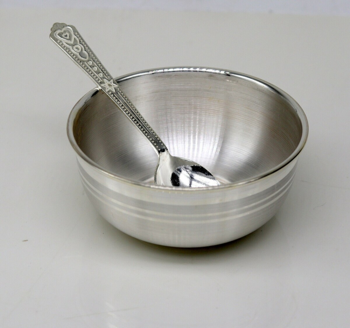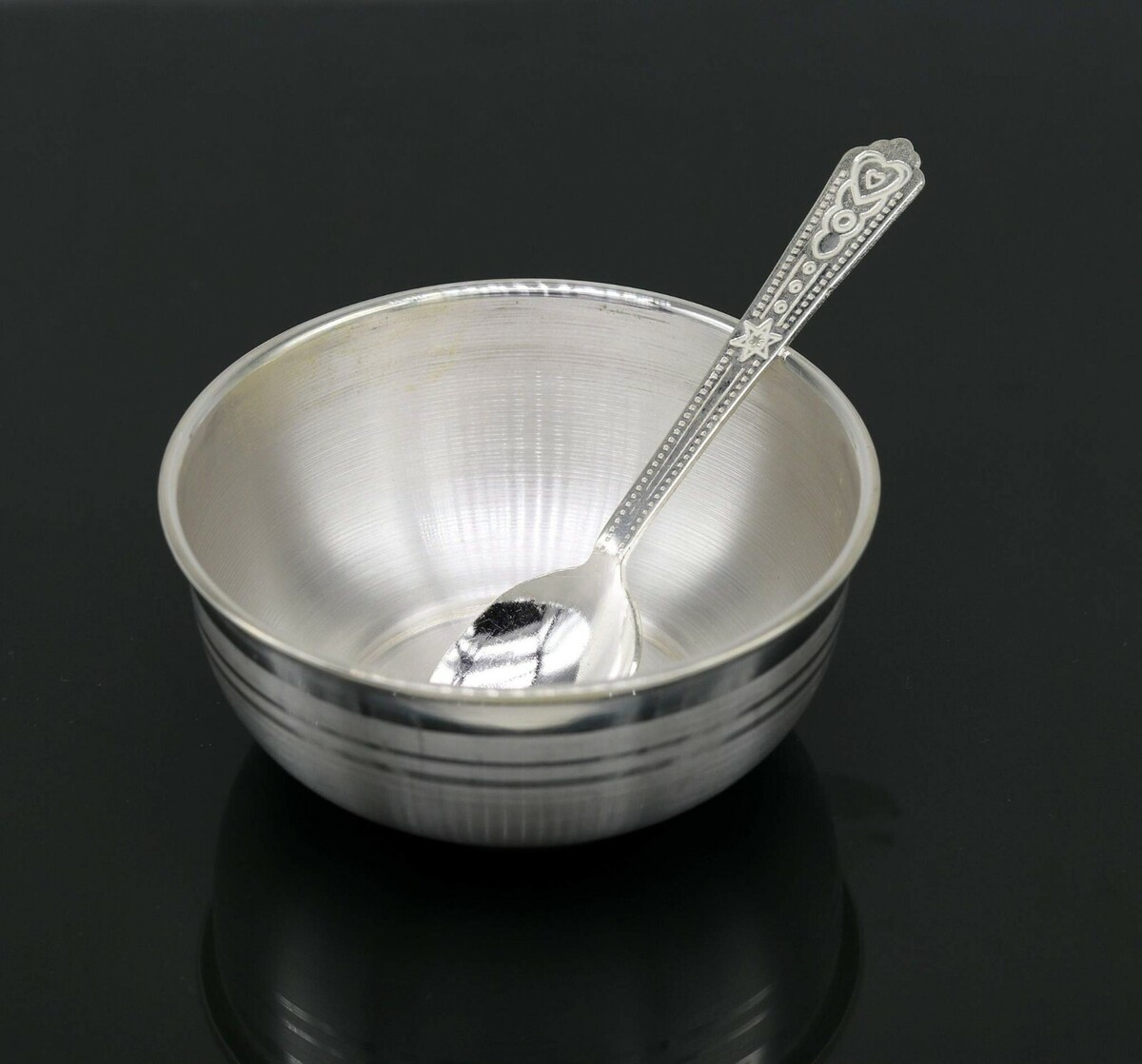 999 fine silver handmade bowl and spoon set, excellent gifting home dining decor silver vessels, Indian opinion is silver has proven antibacterial properties. It is believed that eating out of the same is healthy and can help prevent disease-causing bacteria from spreading. This is one of the main reasons medicines are given to babies in silver bowls or trays.