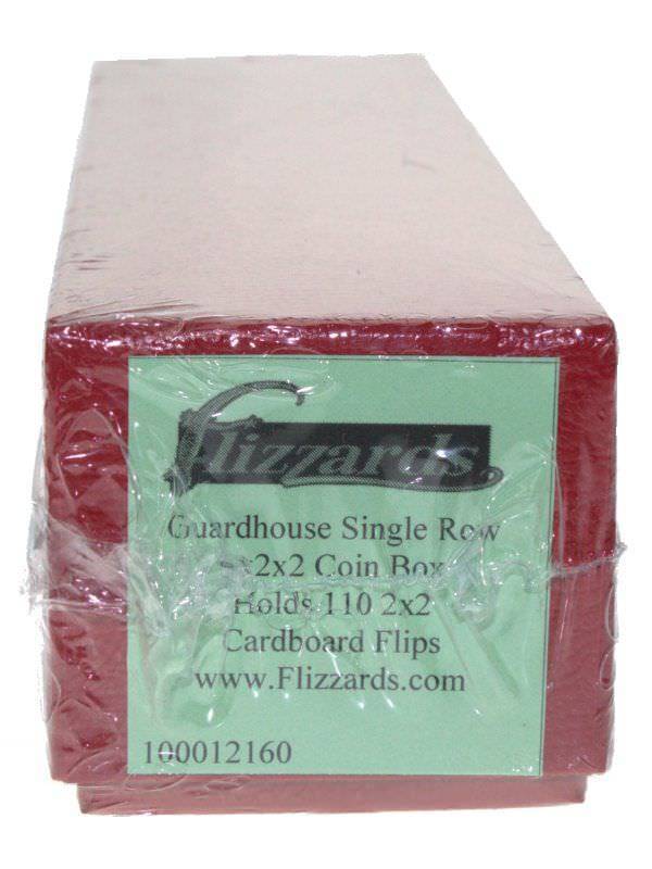 Single row red 9x2x2 regular duty box - durable and strong with high quality, textured exterior wrap. Use regular duty boxes for storage and organization of your precious collectibles. 700 Assorted 2x2 Cardboard Guardhouse Coin Flips (Mix and Match). Choose either all penny, nickel, dime, quarter, half, small or large dollar / or the pre-selected / default assortment of the following: 100 Penny, 100 Nickel, 100 Dime, 100 Quarter, 100 Half Dollar, 100 Small Dollar and 100 Lg. Dollar. Packed in bundles with increments of 25. Guardhouse paper holders are super clean, dust free.