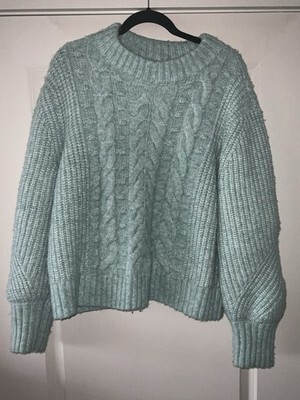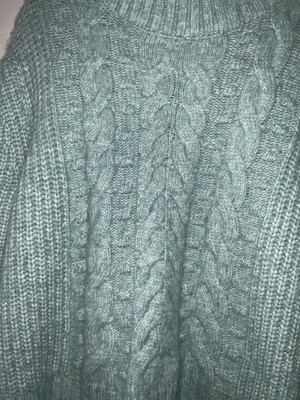The A New Day knit sweater is a stylish and comfortable crewneck pullover in a size large and a trendy green color. This sweater features a cable knit design, making it a fashionable choice for women looking to add a touch of texture to their wardrobe. The knit fabric ensures a cozy feel, perfect for layering over tops or dresses for a versatile and chic look. Pit to pit-26 inches Length-23 1/2 inches
