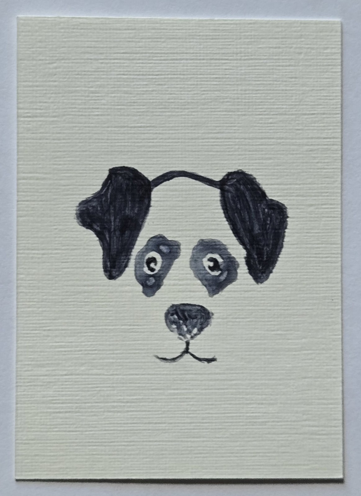 A charming minimalist miniature painting of a dog in bold black and white, perfect for collectors of cute and simple animal-themed art.