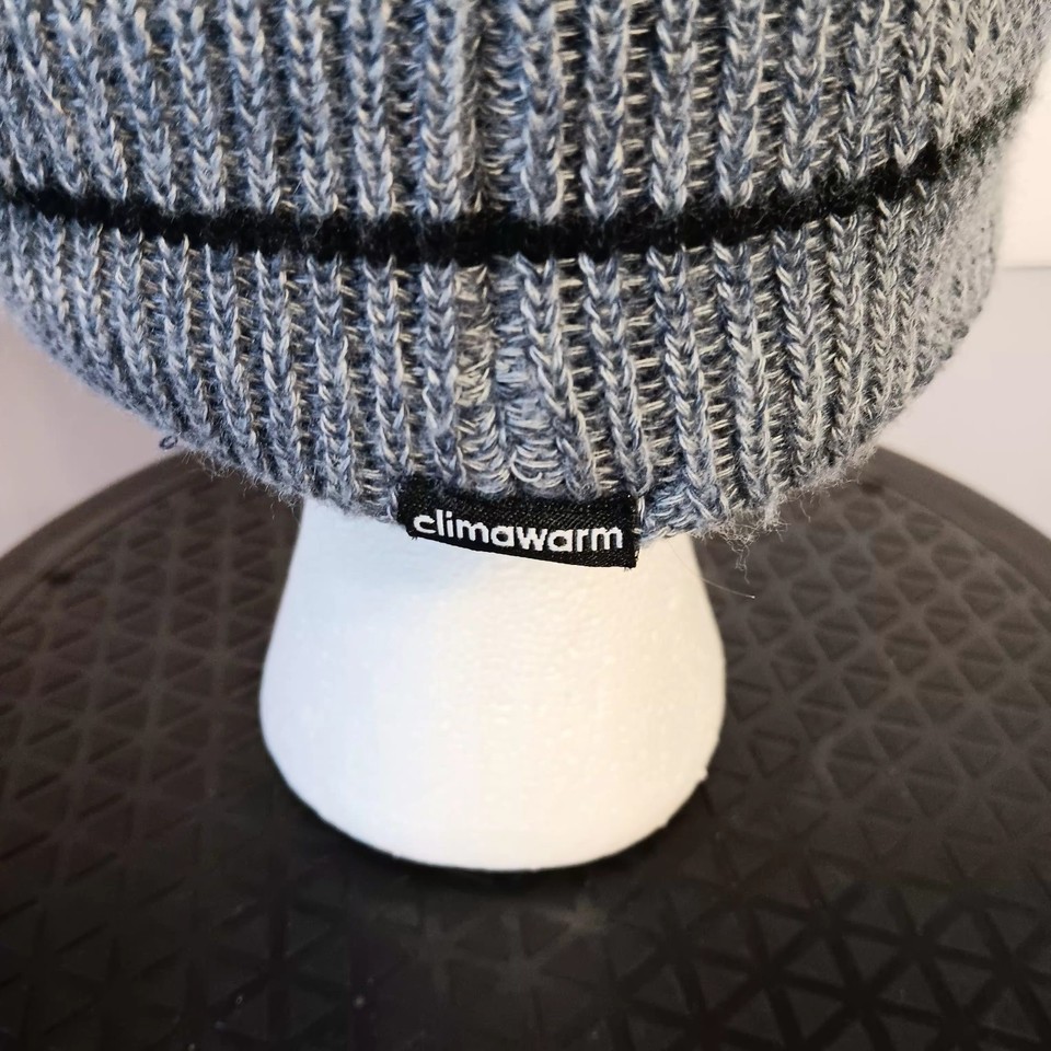 The ADIDAS Brimmer Winter Knit Beanie Hat Cap is a stylish and functional accessory for men during the winter season. Made from acrylic blend materials with a striped pattern in gray with black stripes, this beanie is lightweight and stretchy for comfortable wear. It features Climawarm technology to keep you warm and features a classic streetwear style that is perfect for outdoor activities or casual wear. The one-size-fits-all design makes it easy to add to your winter wardrobe, and the knit fabric adds a touch of texture to the overall look. Good condition with normal wear.