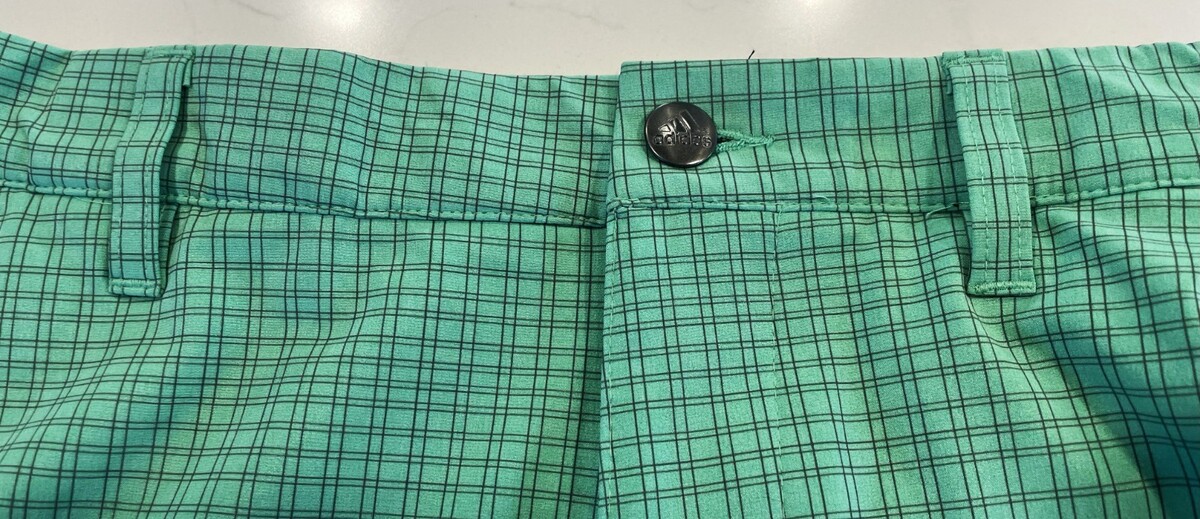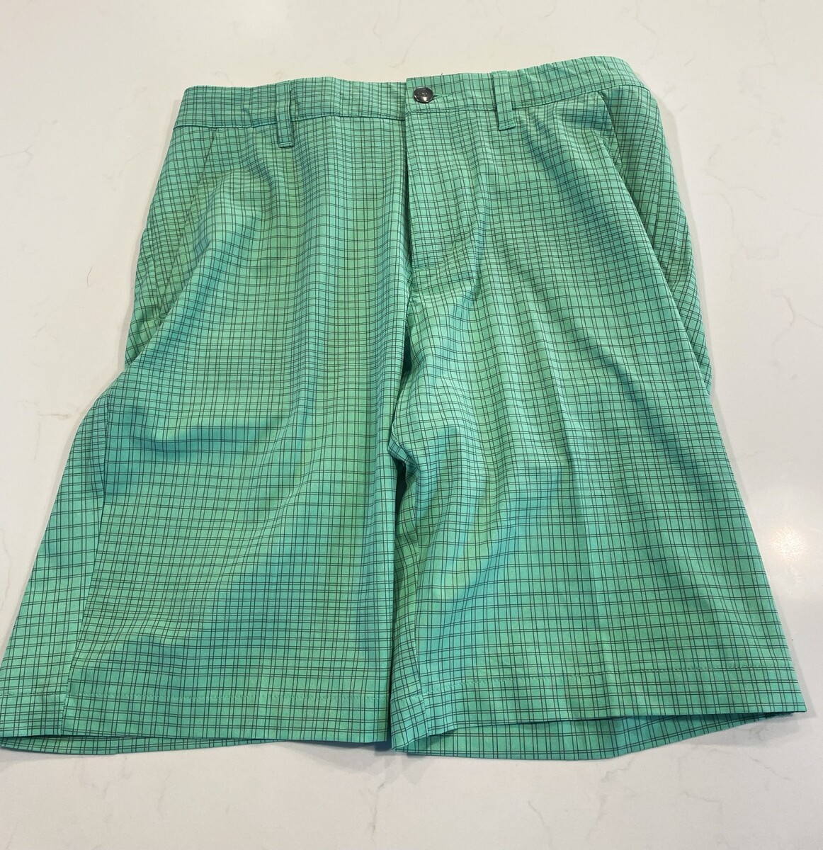 Up for sale are these ADIDAS Men?s Green or Teal Golf Shorts in size 30. They are designed for comfort and performance on the golf course. Made with a lightweight blended fabric of polyester and spandex, these athletic-style shorts feature a geometric pattern, zip closure, and mid-rise waist. With a 10-inch inseam and plenty of pockets, including slash pockets and belt loops, these shorts are ideal for summer, fall, and spring seasons. The green color, logo accents, and easy-care features make them a stylish and practical choice for any golfer looking to improve their game in style.