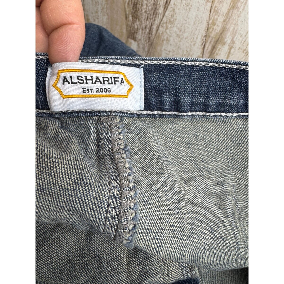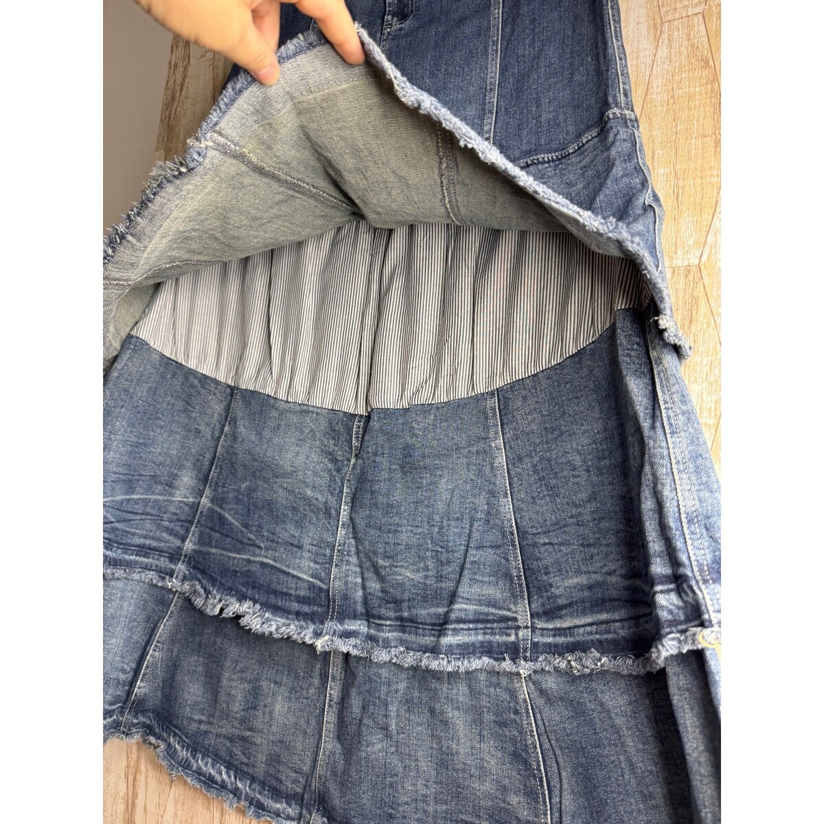 Keywords: ALSHARIFA skirt, women's denim skirt, maxi skirt, tiered skirt, distressed denim, frayed hem, boho skirt, size 12 skirt, long denim skirt, casual skirt, summer skirt, festival skirt, prairie skirt, bohemian style, vintage inspired