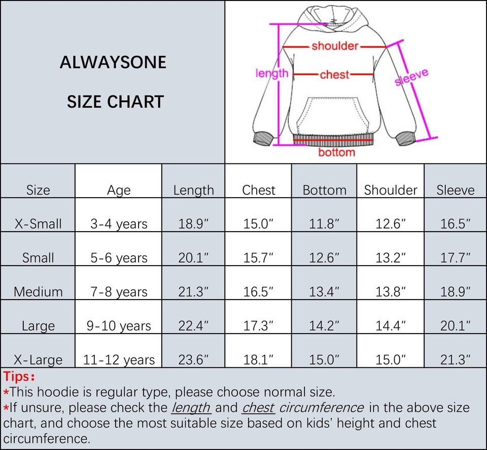 SIZE TIPS: The size of this kids pullover hoodie is based on American size standard, for every children has different height and weight even in the same age, pls check our size chartlast image to choose the suitable size according to children's actual height and weight
