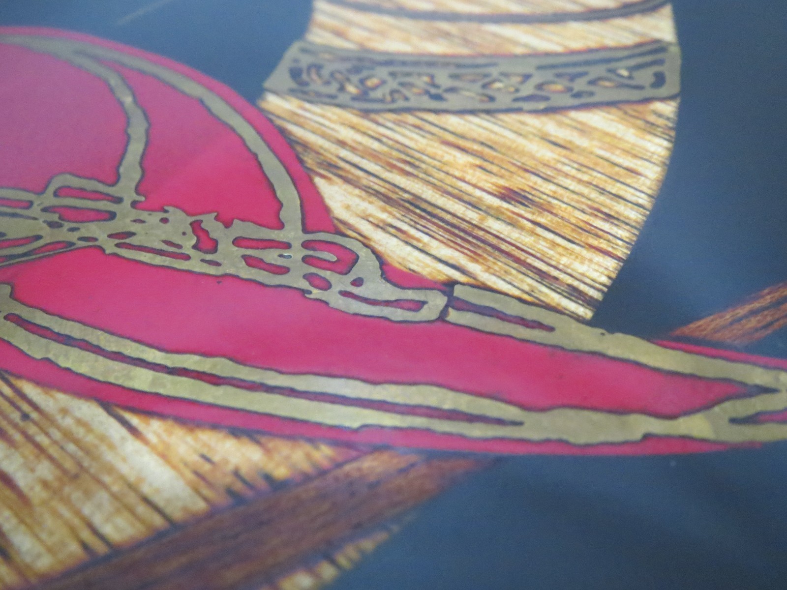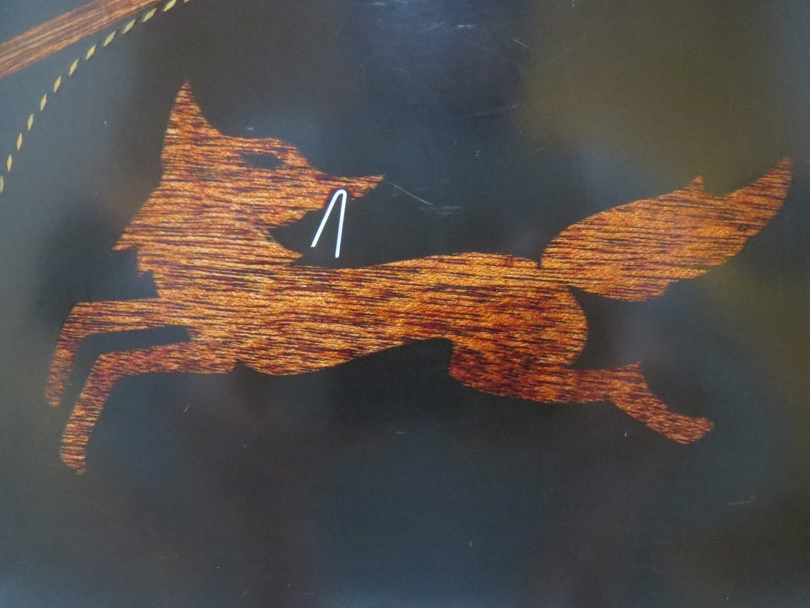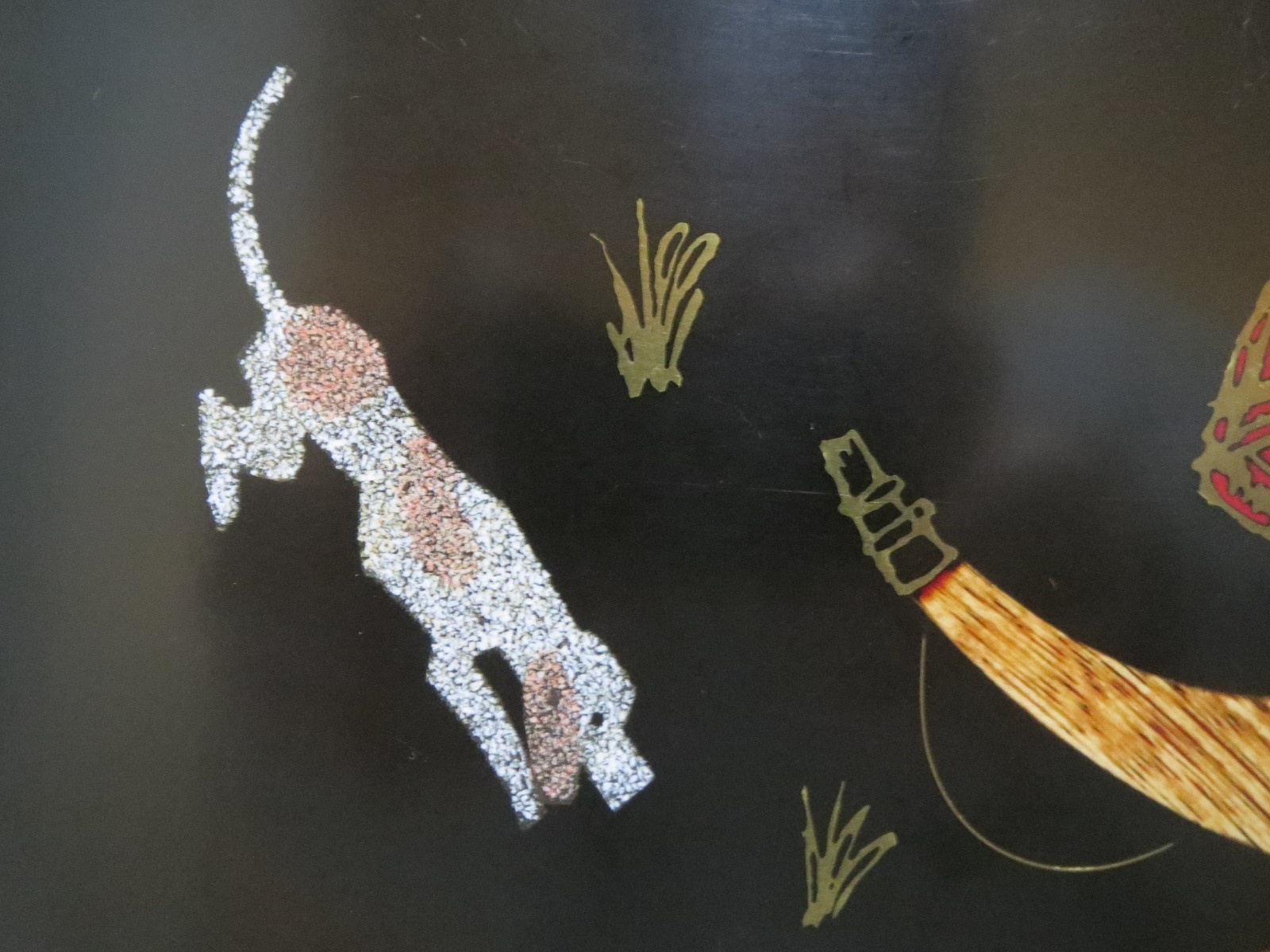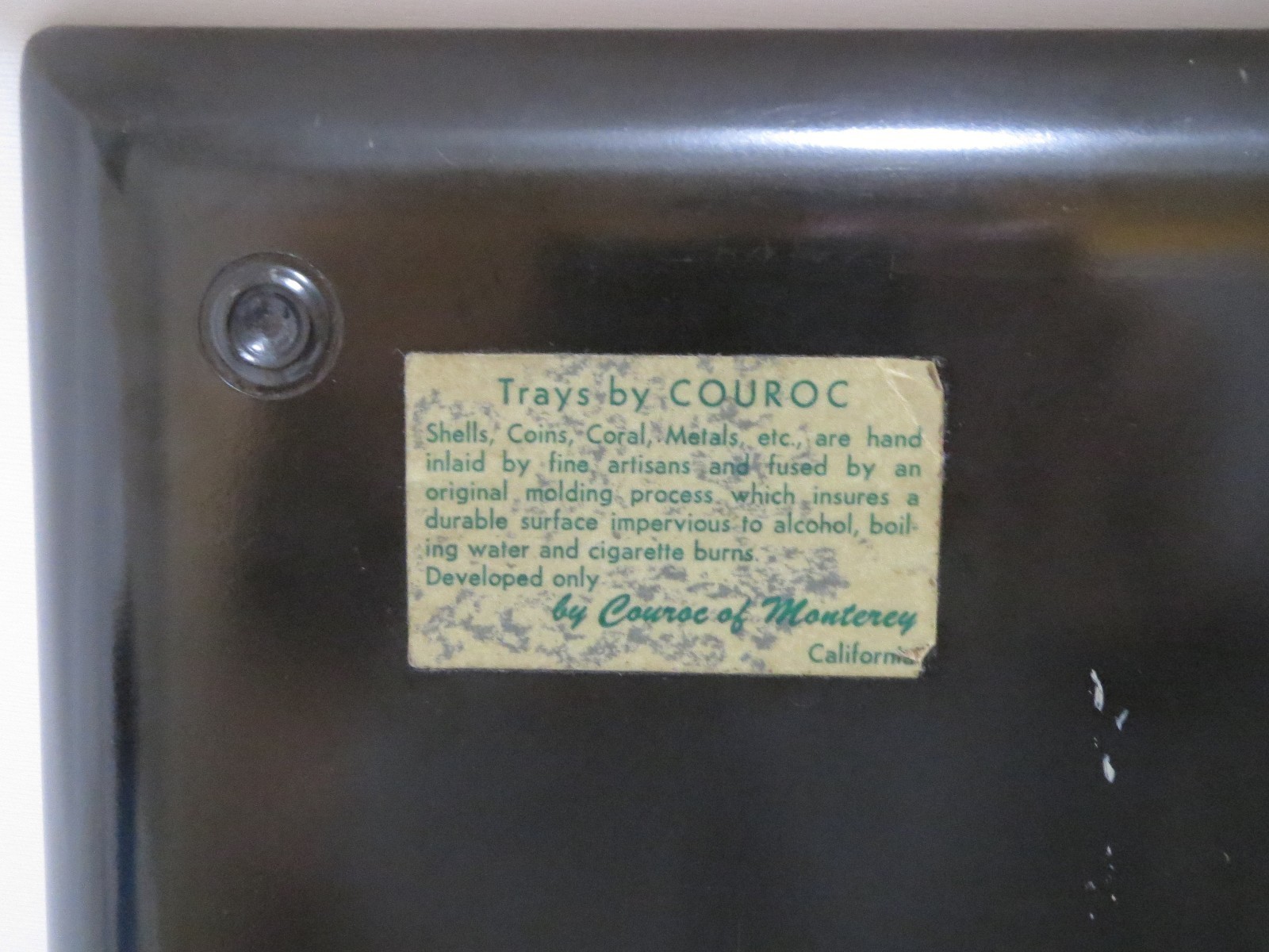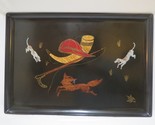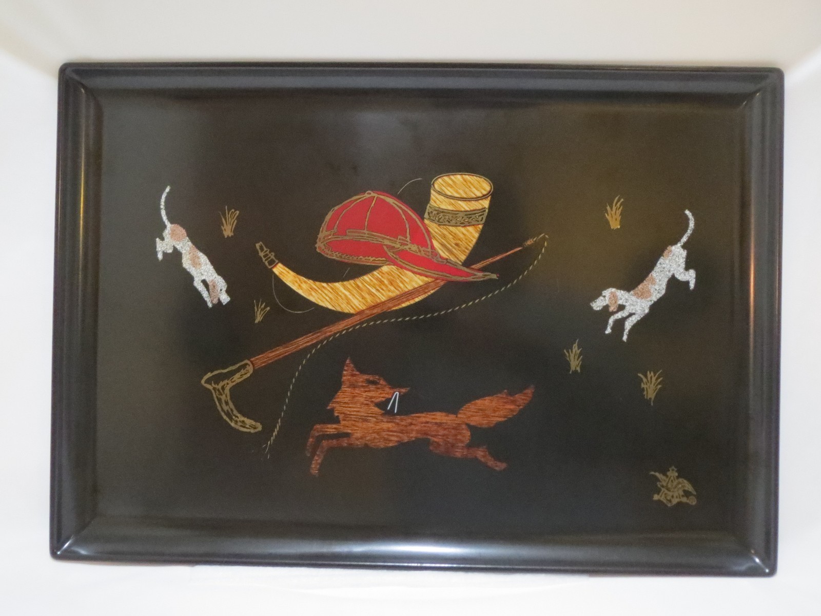 This is a really neat, RARE, vintage Couroc piece made for Anheuser Busch. I think it was made in the 60's but not for sure. I has really cool inlay made of metal, wood, coins, coral and fused by an original molding process which insures a durable surface impervious to alcohol, boiling water and cigarette burns. Is depicting the items traditional to a fox hunt , with the fox, beagles, cane whip, horn, and hat, with the Anheuser Bush logo on the bottom right.