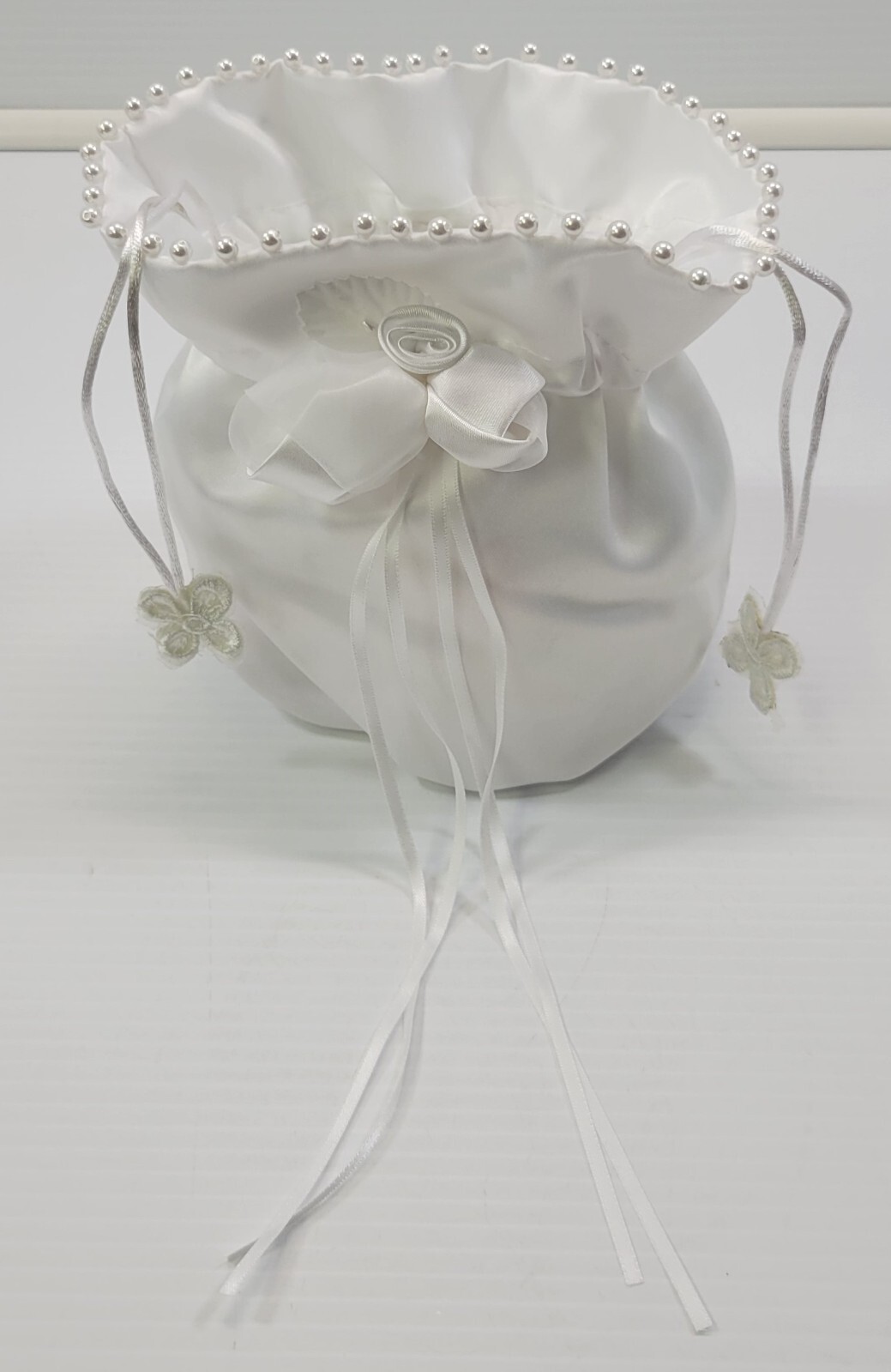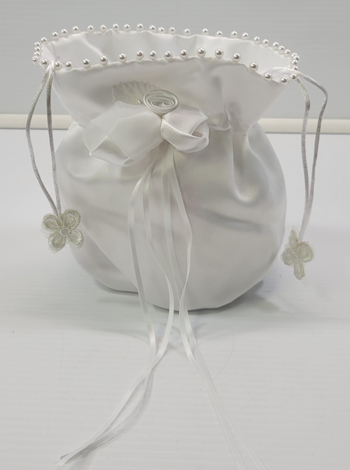 - AR) White Satin Wedding Bridal Flower Girl Purse Money Bag with Faux Pearls