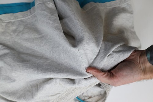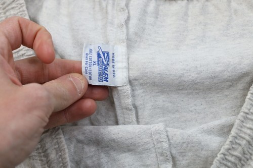 Holes back butt seam. Blemishes and yellowing front and back. Elastic in waistband is stretched. USA made