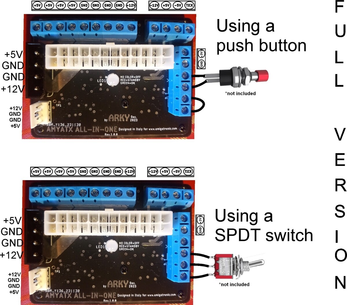 AMYATX ALL-IN-ONE is available as fully assembled, tested, and ready to use with a synchronization signal (AKA "TICK") at 50Hz PAL or 60Hz NTSC, with in addition two connectors to power a hard disk and a floppy disk drive, a supplementary circuitry for immediate on and delayed off of 5 seconds by means of a momentary button, and a 2-pin terminal block for output voltage of +3.3V.