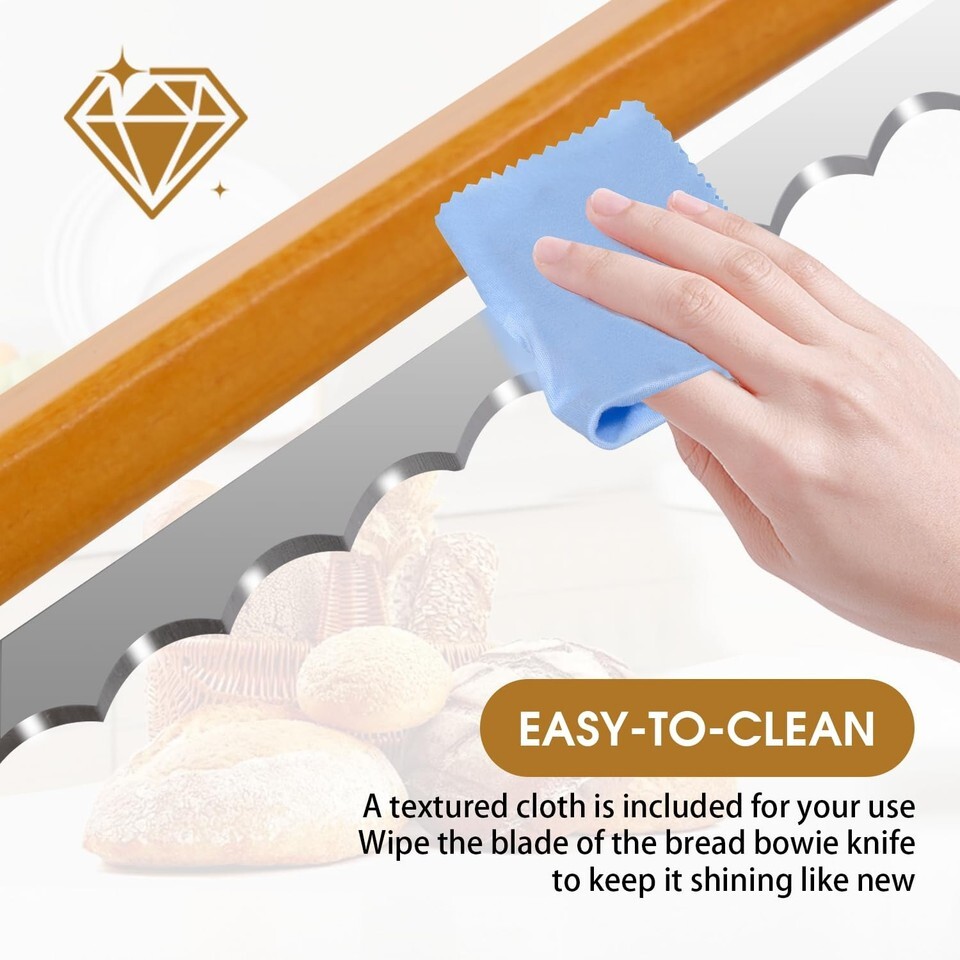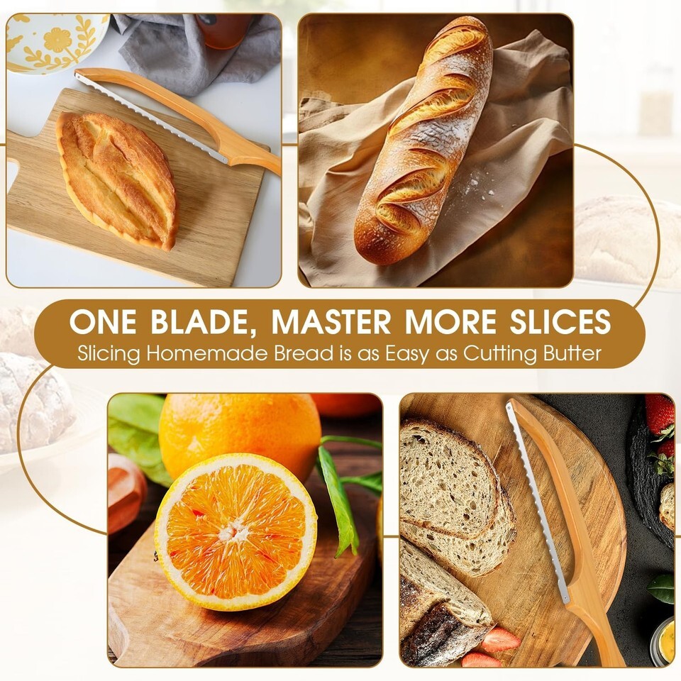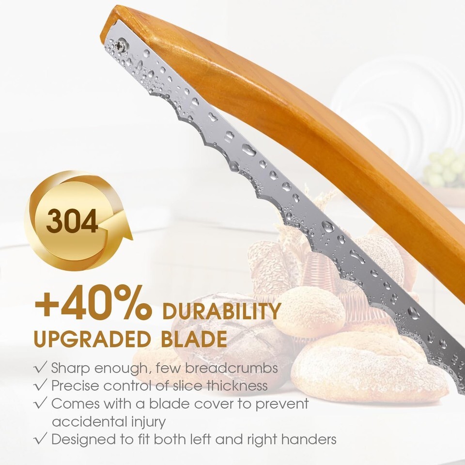 BLADE UPGRADE: Unlike other bread knives, our blade is 40% more durable with prominent serrations. It has been tested by 1000 times of hard baguette cutting and still maintains HRC60 hardness, easy to cut through the hard crust of sourdough bread without crushing the inside.