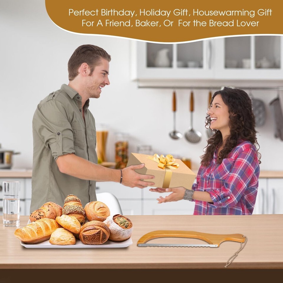 SOLID WOOD HANDLE: This bread knife for homemade bread is made of premium logs, sturdy and durable.Perfect birthday, holiday gift for a friend, baker, or housewarming gift for the bread lover (including 1* bread knife, 1* knife holder, 4* replacement screws, 1* cleaning rag, 1* lanyard)