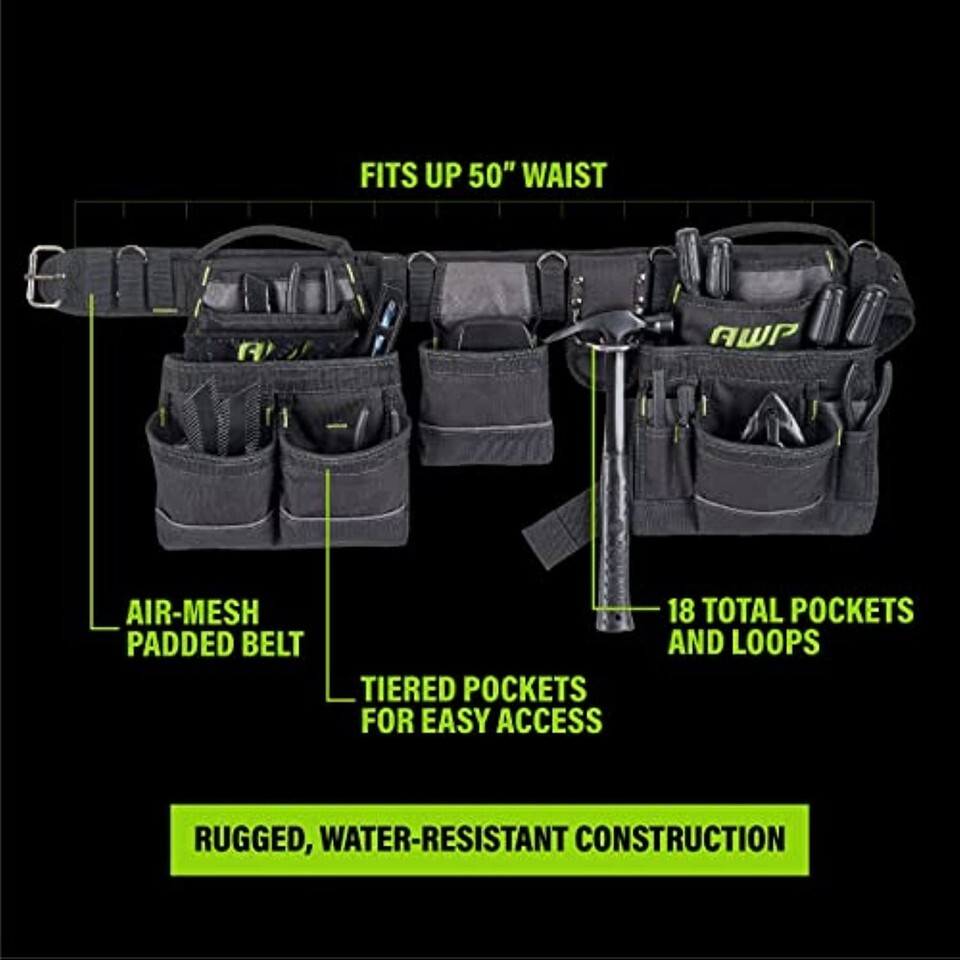 AWP General Construction Carpenter Tool Rig | Padded Adjustable Tool Belt | Black | Fits Up to 50" Waist Size