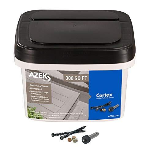 Product description: Azek decks harvest collection offers a pleasing palette of soft shades that complement the most popular home exterior colors.; ; Brand Name: Azek Sub Brand: Cortex Length: 2-3/4 in. Color: Island Oak Drive Style: Torx TTAP Head Type: Star Head Product Type: Hidden Deck Fastener Container Size: 1050 lb Self Tapping: Yes Material: Carbon Steel Driver Bit Included: Yes Thread Type: Coarse Packaging Type: Bucket Coverage: 300 sq. ft.
