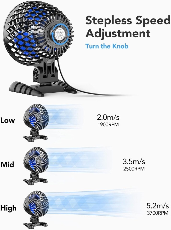 ?Stepless Speed Regulation?Turn the knob and enjoy wind from gentle to strong, or any speed you want in between. More speed options will meet your needs in different scenarios, allowing you to find the perfect coolness.