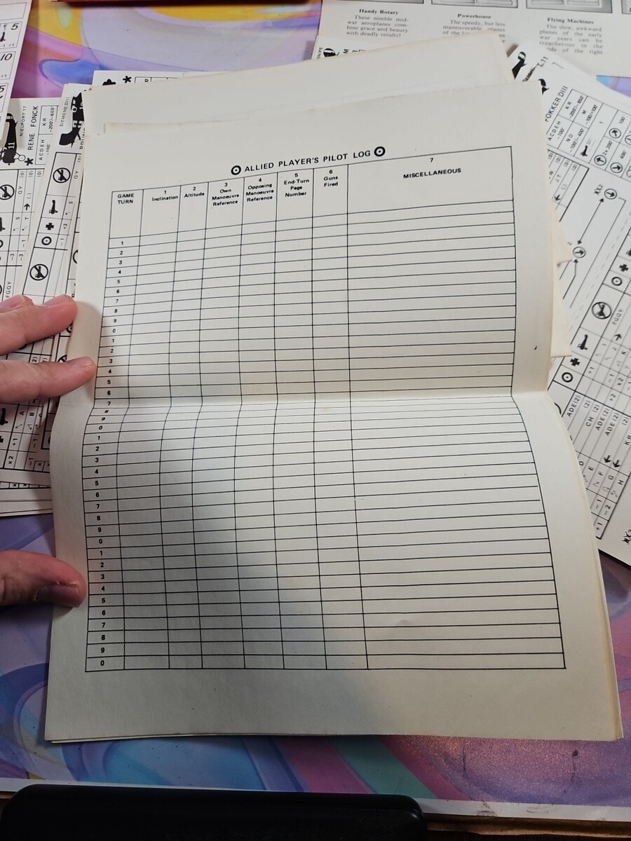 This seems to include quite a few pieces from (what I believe is) the Deluxe version, including quite a few plane cards (13 in total). Also included are some copies of the Flight Log scoring cards, since the original instructions/log are missing.
