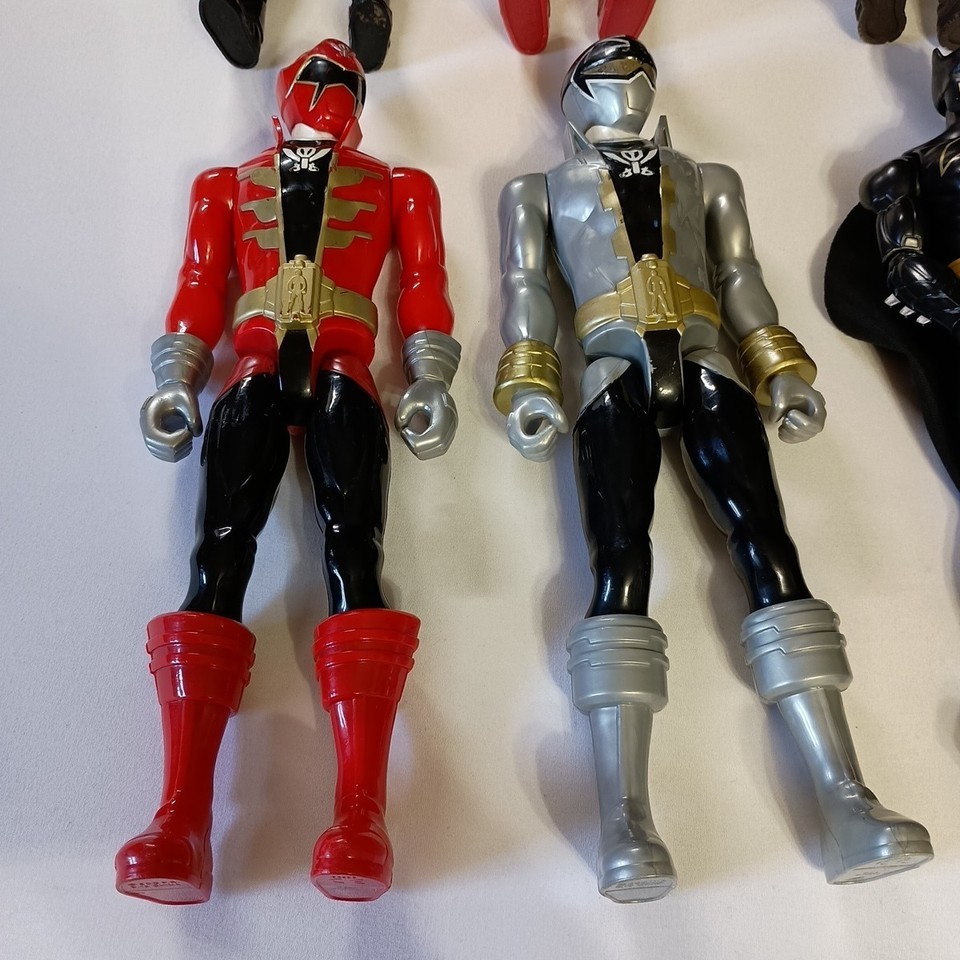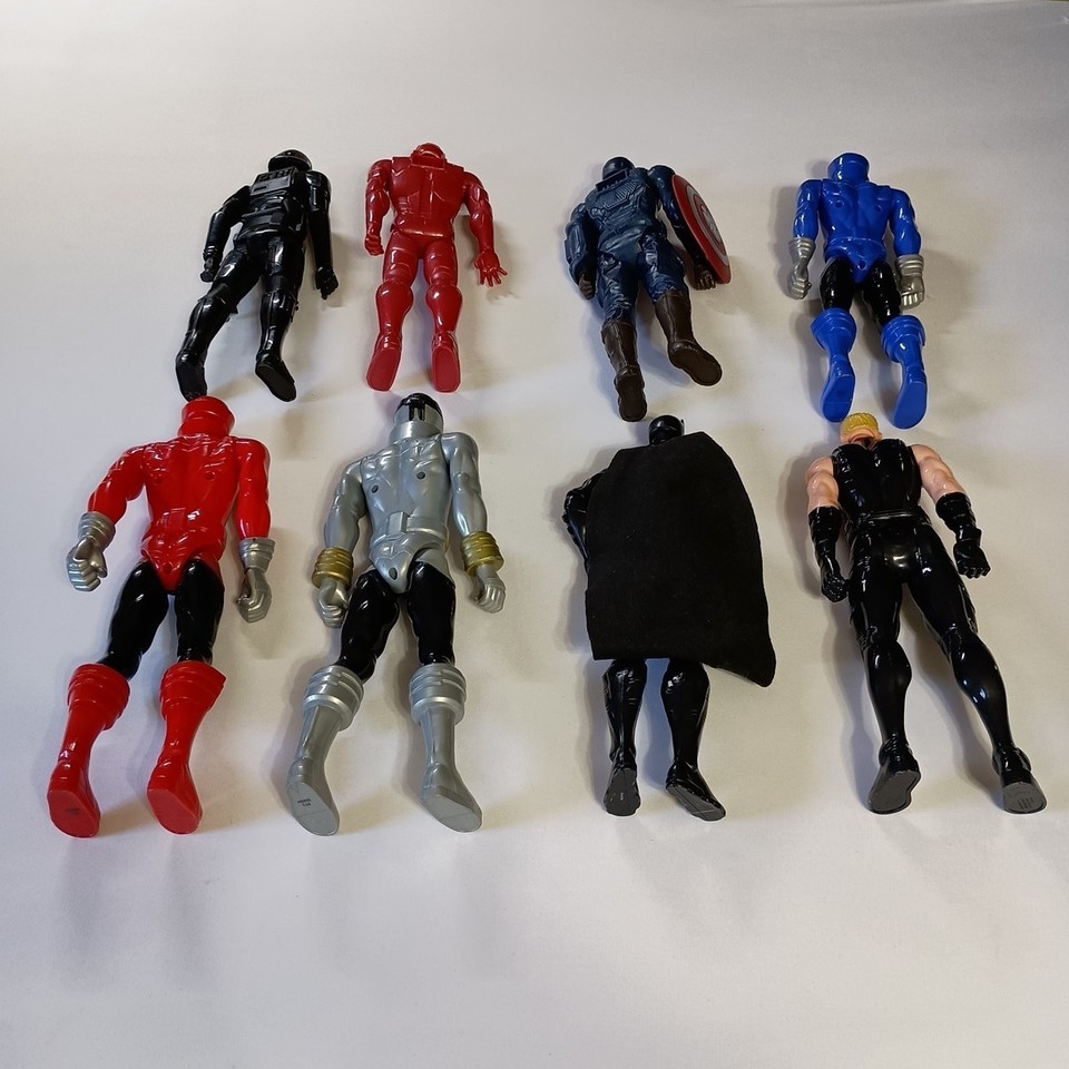 This action figure set includes a mixed lot of 8 superheroes from the Avengers franchise, including Ironman, Batman, Thor, Rangers, and more. Each figure stands at 12 inches tall and is made of plastic. The figures are from the 2013 release and feature characters from Marvel's The Avengers movie and TV show. They are unboxed and adjustable, perfect for imaginative play or display. The set includes Captain America, Ironman, Thor, and Batman, in addition to other characters, all in vibrant multicolor costumes. Mixed lot of ( 8 ) action figures. Normal wear. Sizes are approximate.