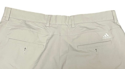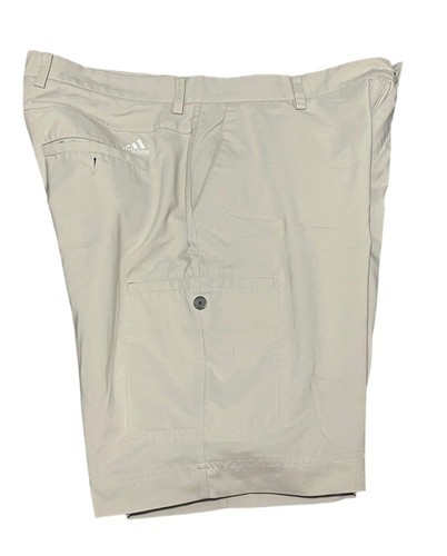 These are men's Adidas casual lightweight golf shorts, size 36. They have an 11-in inseam. Very light tan color. Cargo style with pockets on the side. Very lightweight and breathable. Wrinkle resistant. Excellent condition!