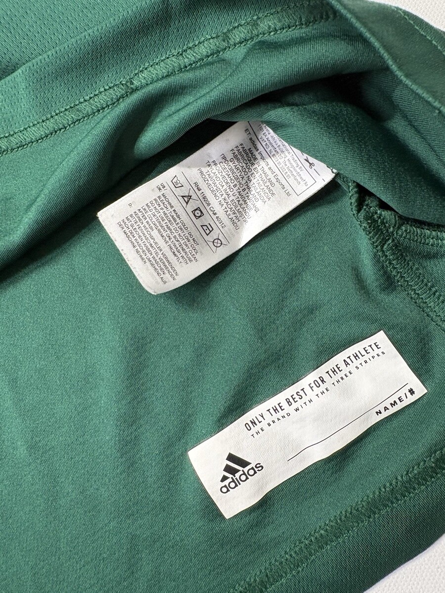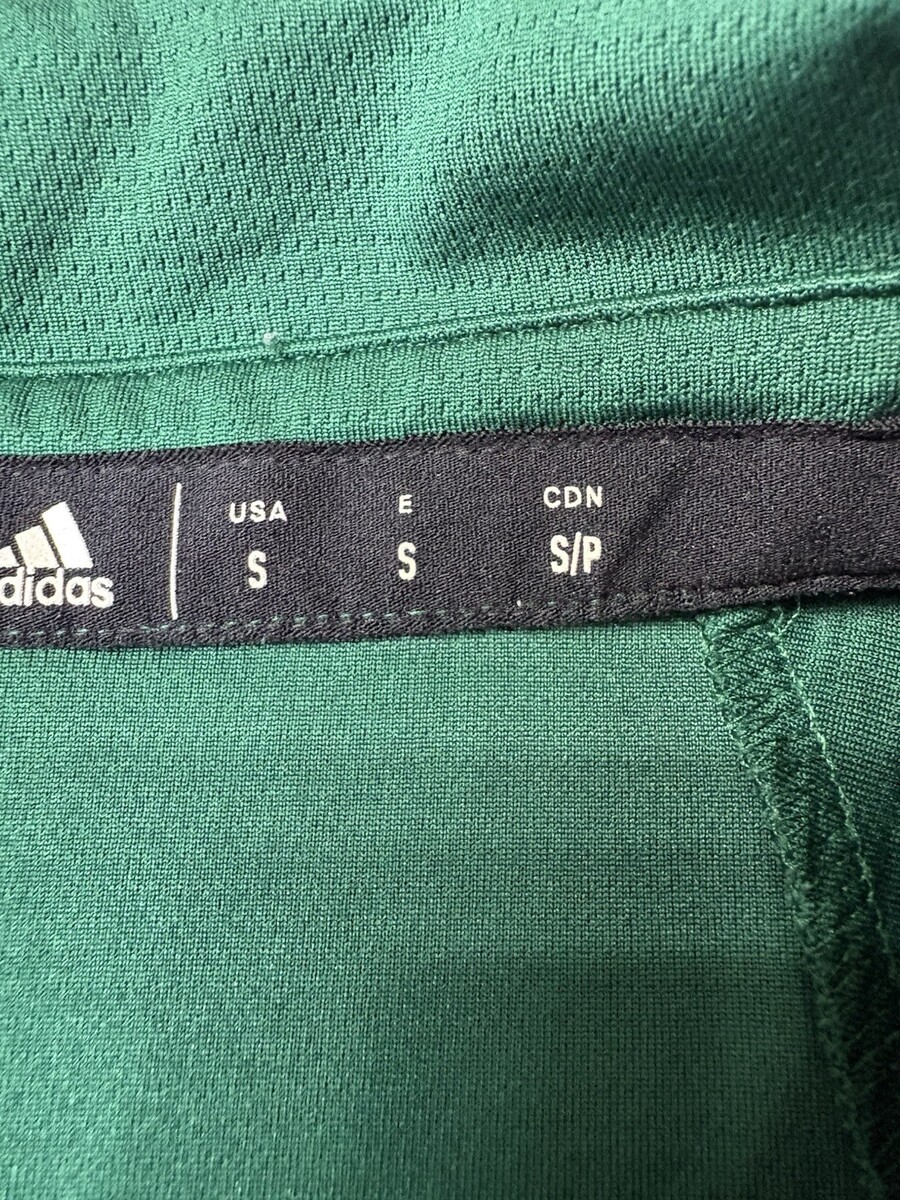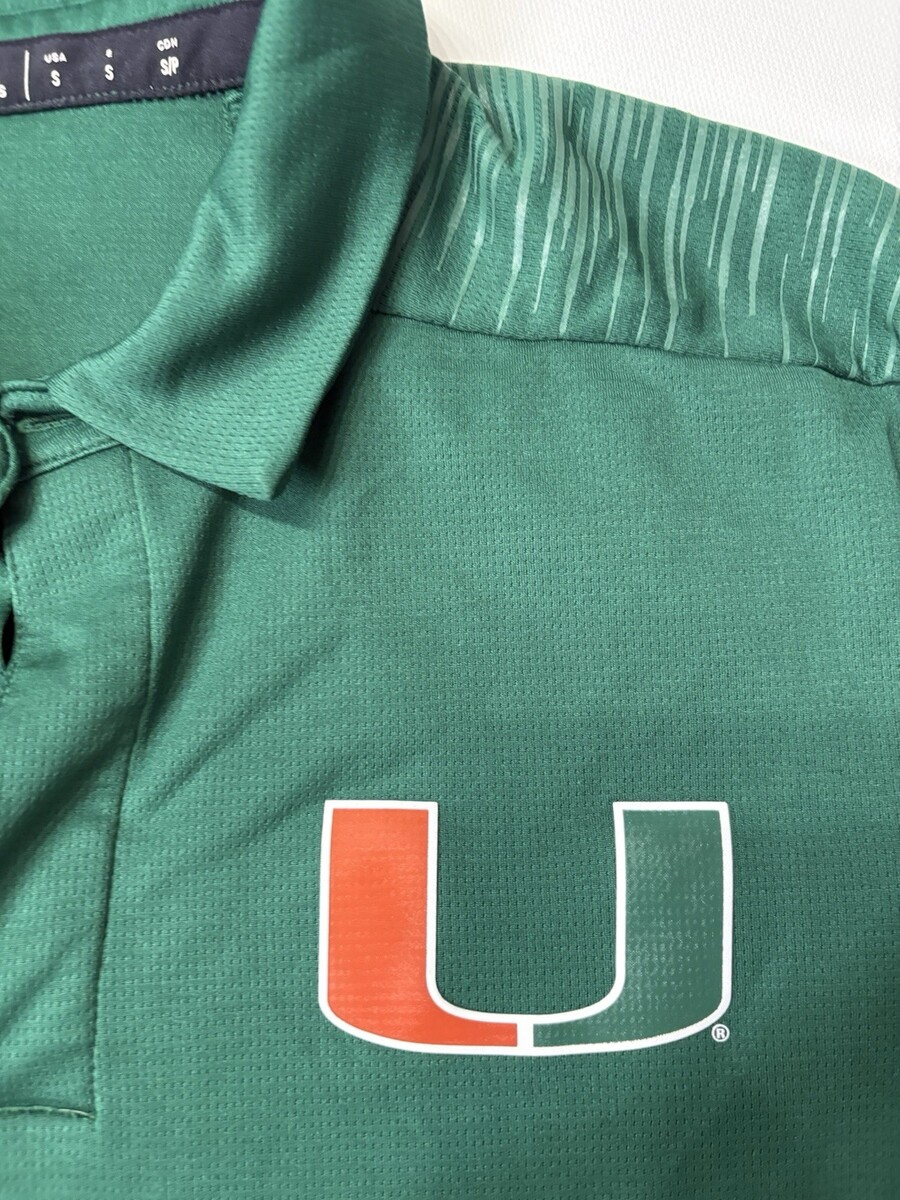 The product is a men's size small Adidas Miami Hurricanes polo shirt in green, officially licensed by NCAA. This shirt is a great way for fans of the football team to show their support in style. Perfect for wearing to games or during bowl games, this short sleeve shirt is a must-have for any Miami Hurricanes fan looking to represent their favorite team in a stylish and comfortable way.