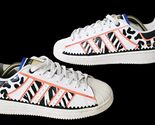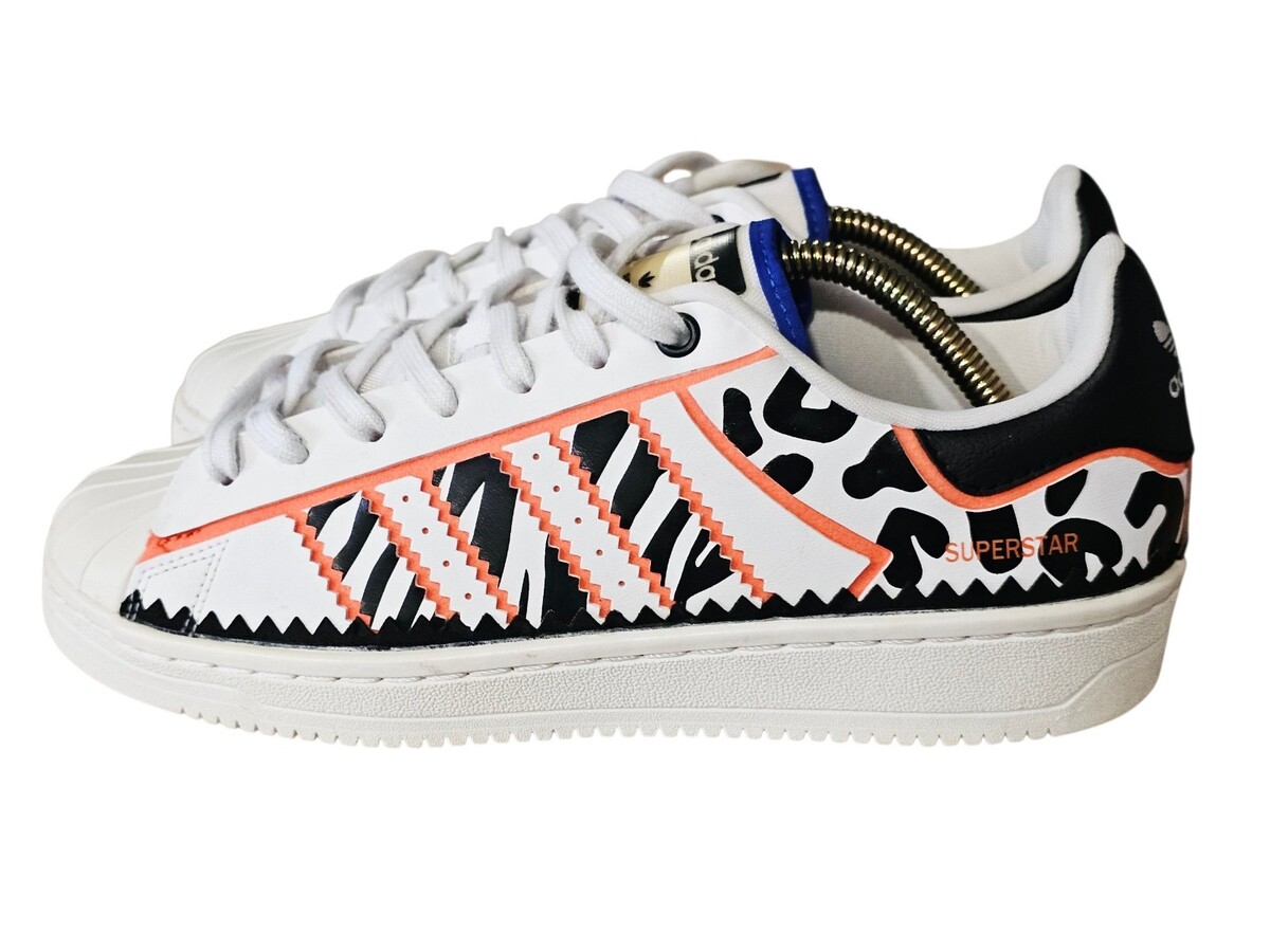 The Adidas Rich Mnisi Superstar OT Tech South African Shoes in women's size 9 (UK 7.5) are a stylish sneaker featuring a lace-up closure and low-top shoe shaft style. The shoes boast a unique animal print pattern and are accented with lace and the adidas logo. Made with recycled materials and a foam insole, these sneakers are perfect for casual occasions during the summer, fall, and spring seasons. The multicolor design and leather upper material add a touch of sophistication to the shoes, making them a fashionable choice for everyday wear.