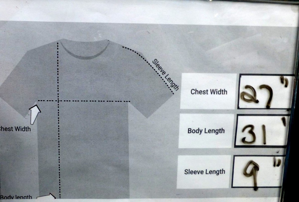 Chest width = 27", Body length = 31", Sleeve length = 9".
