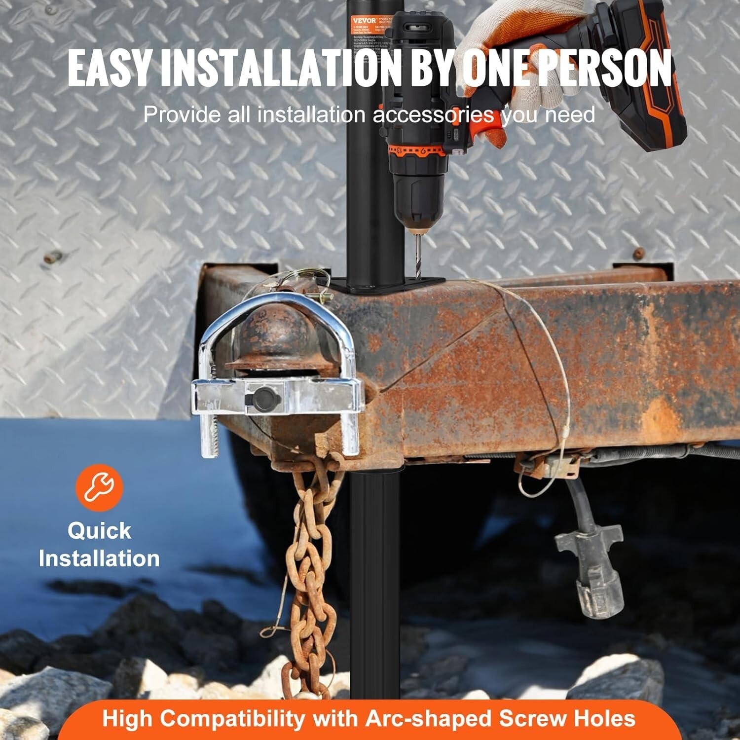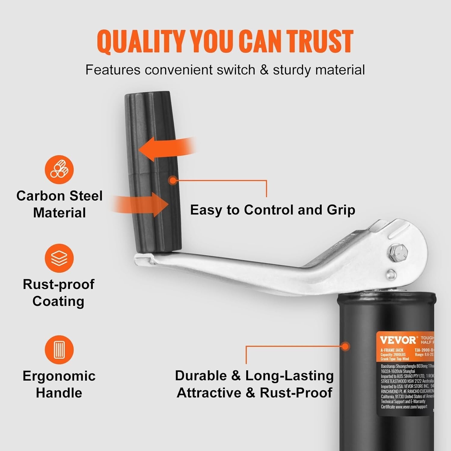 Upgrade your towing setup with the VEVOR Heavy-Duty Trailer Jack, designed to support loads of up to 2000 lbs with ease. Crafted from durable carbon steel and finished with rust-resistant coating, it guarantees long-lasting performance and stability. Its adjustable height (25" to 22.44") ensures a level trailer on any terrain, while easy installation and a swivel feature enhance maneuverability. Perfect for various trailers including travel and horse trailers, it includes a detachable handle for manual operation during power outages or emergencies. To ensure fast and reliable delivery, we work with multiple fulfillment partners and suppliers. Depending on availability and location, your order may ship from different warehouses or arrive in packaging that varies from item to item. Tracking details are typically provided shortly after shipment, and customer satisfaction remains our top priority. Please note that due to carrier policies and regional regulations, certain items may not be eligible for delivery to specific states or territories.