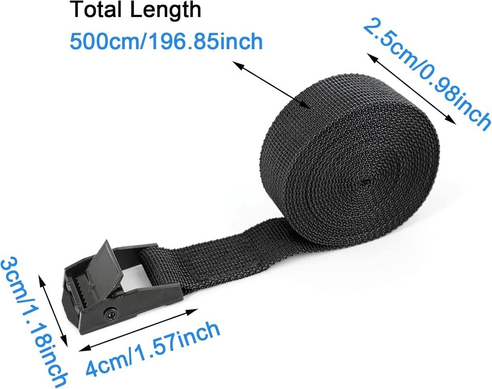 Each strap measures 5m x 2.5cm (L x W) / 197 x 0.98 inches, making them adjustable for all types of cargo.