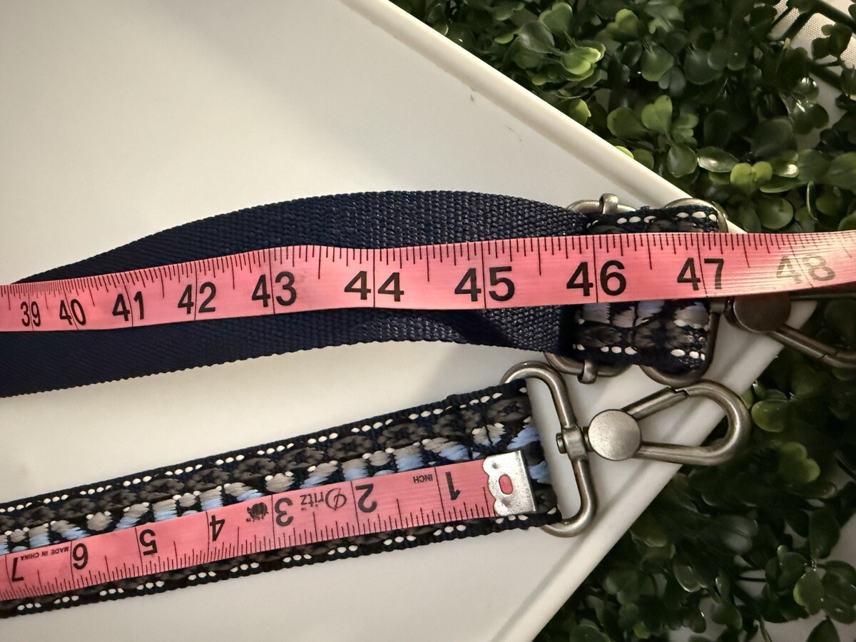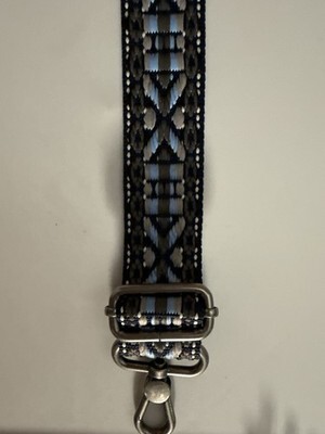 The Adjustable Bag Strap in Blue Black Geometric Woven Guitar Style Crossbody is a stylish and versatile accessory for women. Made with a woven fabric featuring a geometric pattern, this medium-sized strap is designed for a comfortable crossbody style carry. The blue handle color and silver hardware accents add a touch of sophistication, making it perfect for a variety of outfits. With an adjustable strap drop and detachable accessory, this bag strap offers both functionality and convenience for any music-inspired fashionista.
