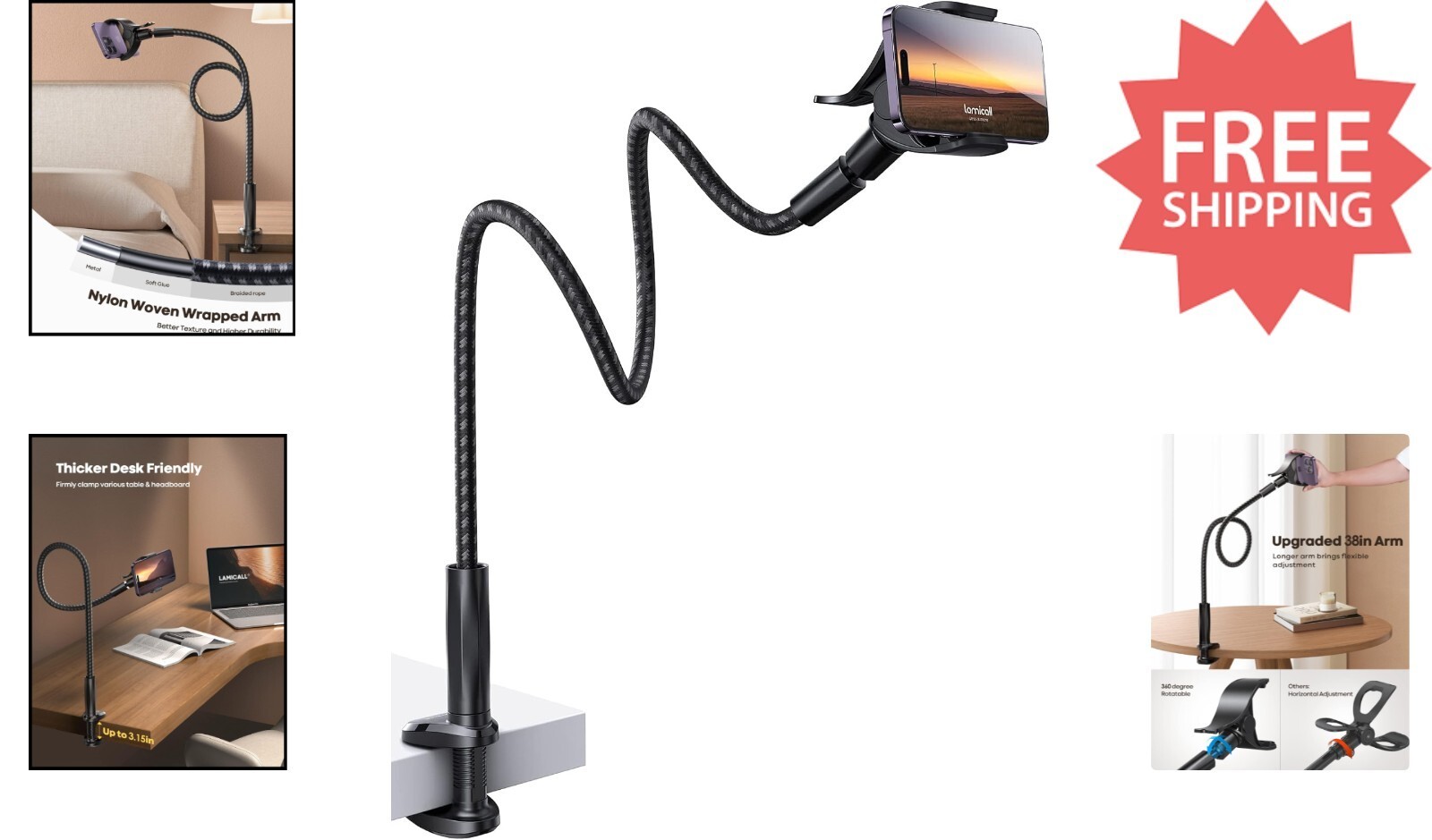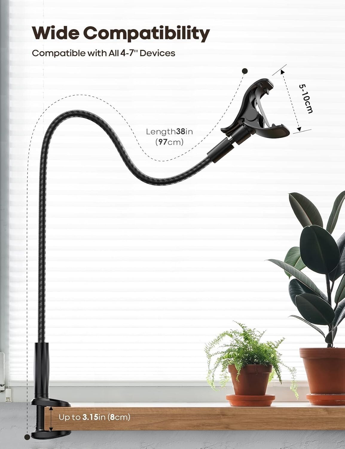 - Adjustable Gooseneck Phone Mount - 360° Rotatable Clamp for 4-7" Devices