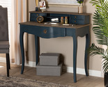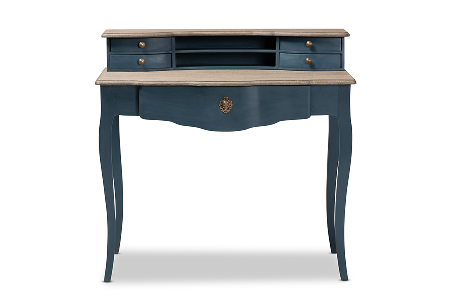 A classic French silhouette is combined with a rich blue finish to give the Adora writing desk a uniquely contemporary elegance. This stunning piece of furniture is crafted from bayur wood in a rich blue spruce finish that is complemented by the white-streaked natural veneer tabletop. Its traditional French inspired design features graceful saber legs and carved brass drawer knobs. Designed to add both beauty and function to your space, the Adora is fitted with ample storage capacity. One large drawer provides space to store folders and documents, while four smaller drawers and two shelves provide storage space for writing utensils and stationary. The Adora writing desk is made in Indonesia and requires assembly.
