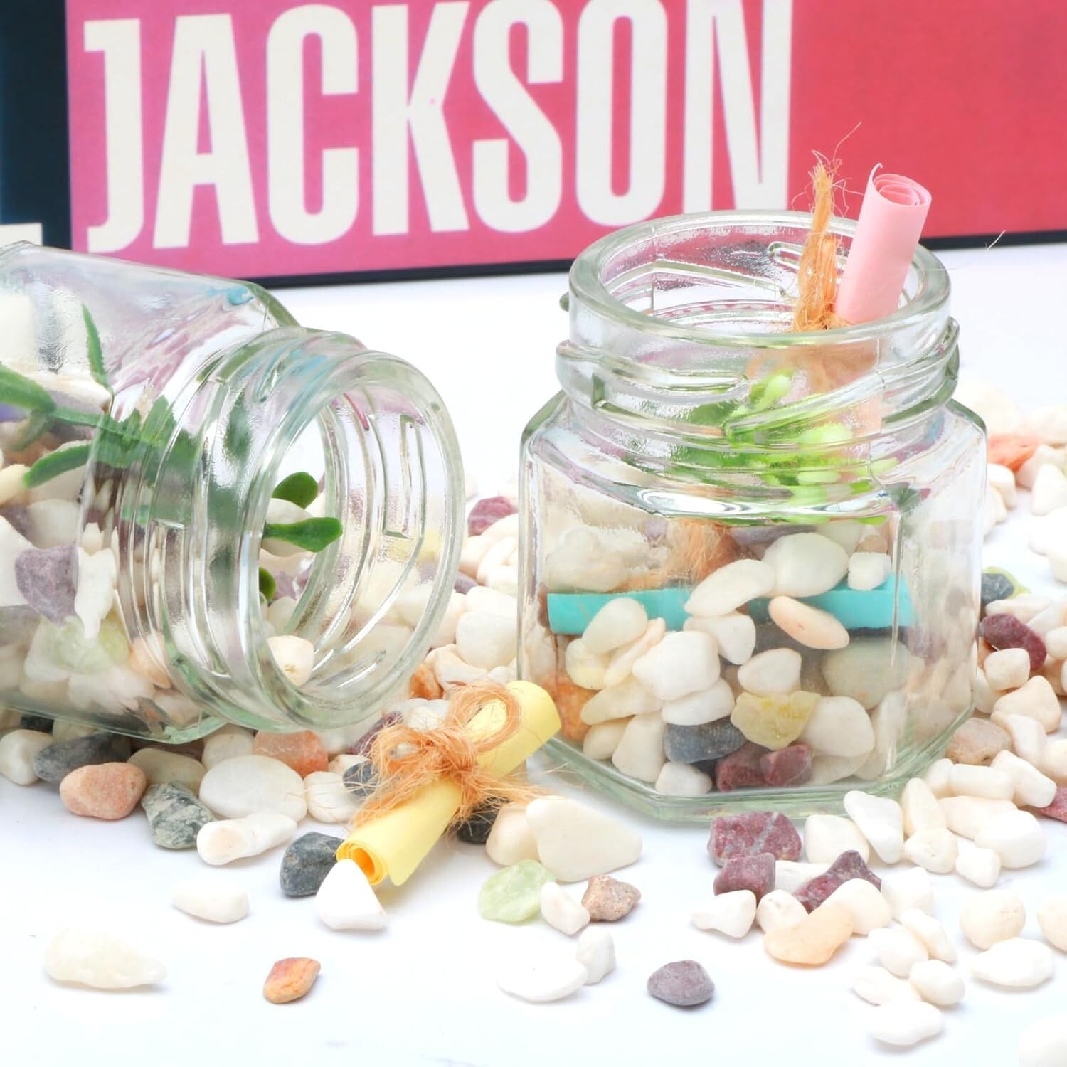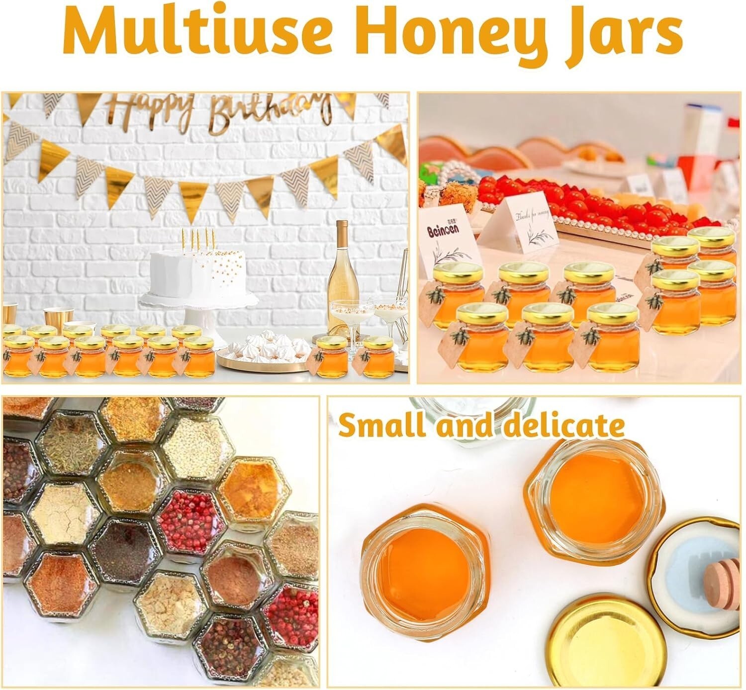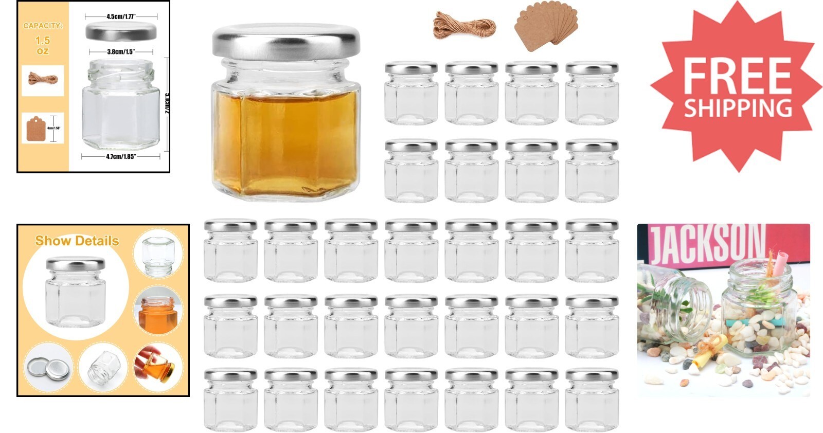 Discover the charm and versatility of our Value Set of 30 Mini Hexagon Glass Jars, each with a 1.5oz capacity. Crafted from thick, durable glass with a sleek silver lid, these eco-friendly jars are perfect for storing spices, jams, honey, herbs, or small party favors. The transparent design beautifully showcases your contents, while the airtight seal keeps them fresh. Each jar comes with free rustic twine and tags, ideal for personalized gifting or DIY projects. Lightweight and elegant, they are a delightful addition to home decor, parties, or craft setups.