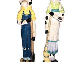 These are a set of two figurines, a tall skinny boy and a girl, depicting a black and white Holstein cow. They are made of resin and stand at 9.75 inches tall. The figurines are perfect for collectors and lovers of farm and countryside themes, especially those who appreciate the beauty of cows.